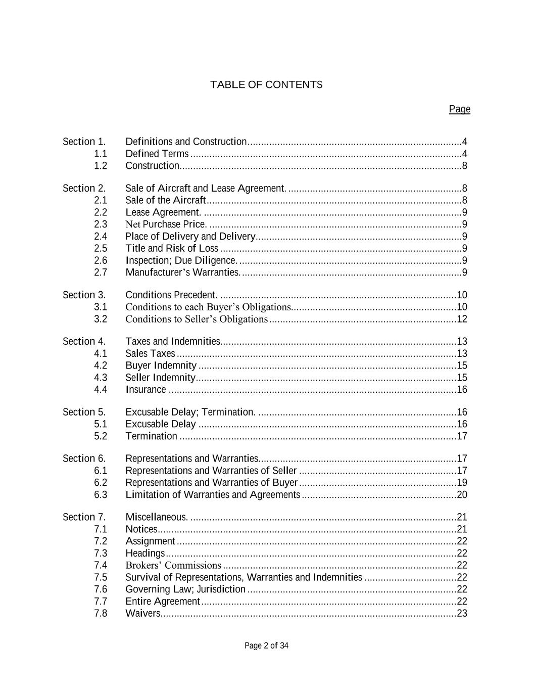 TABLE OF CONTENTS Page Page 2 of 34 Section 1. Definitions and Construction ...............................................................................4 1.1 Defined Terms ....................................................................................................4 1.2 Construction........................................................................................................8 Section 2. Sale of Aircraft and Lease Agreement. ................................................................8 2.1 Sale of the Aircraft ..............................................................................................8 2.2 Lease Agreement. ...............................................................................................9 2.3 Net Purchase Price. .............................................................................................9 2.4 Place of Delivery and Delivery............................................................................9 2.5 Title and Risk of Loss .........................................................................................9 2.6 Inspection; Due Diligence. ..................................................................................9 2.7 Manufacturer’s Warranties. .................................................................................9 Section 3. Conditions Precedent. ....................................................................................... 10 3.1 Conditions to each Buyer’s Obligations............................................................. 10 3.2 Conditions to Seller’s Obligations ..................................................................... 12 Section 4. Taxes and Indemnities. ...................................................................................... 13 4.1 Sales Taxes ....................................................................................................... 13 4.2 Buyer Indemnity ............................................................................................... 15 4.3 Seller Indemnity ................................................................................................ 15 4.4 Insurance .......................................................................................................... 16 Section 5. Excusable Delay; Termination. ......................................................................... 16 5.1 Excusable Delay ............................................................................................... 16 5.2 Termination ...................................................................................................... 17 Section 6. Representations and Warranties......................................................................... 17 6.1 Representations and Warranties of Seller .......................................................... 17 6.2 Representations and Warranties of Buyer .......................................................... 19 6.3 Limitation of Warranties and Agreements ......................................................... 20 Section 7. Miscellaneous. .................................................................................................. 21 7.1 Notices .............................................................................................................. 21 7.2 Assignment ....................................................................................................... 22 7.3 Headings ........................................................................................................... 22 7.4 Brokers’ Commissions ...................................................................................... 22 7.5 Survival of Representations, Warranties and Indemnities .................................. 22 7.6 Governing Law; Jurisdiction ............................................................................. 22 7.7 Entire Agreement .............................................................................................. 22 7.8 Waivers............................................................................................................. 23
