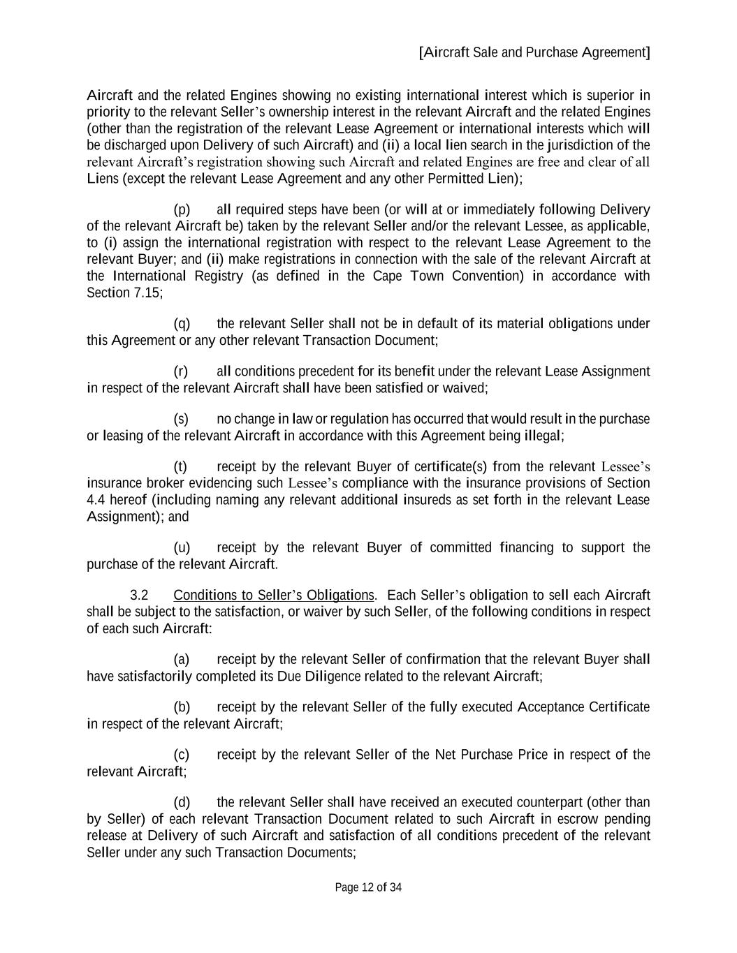 [Aircraft Sale and Purchase Agreement] Page 12 of 34 Aircraft and the related Engines showing no existing international interest which is superior in priority to the relevant Seller’s ownership interest in the relevant Aircraft and the related Engines (other than the registration of the relevant Lease Agreement or international interests which will be discharged upon Delivery of such Aircraft) and (ii) a local lien search in the jurisdiction of the relevant Aircraft’s registration showing such Aircraft and related Engines are free and clear of all Liens (except the relevant Lease Agreement and any other Permitted Lien); (p) all required steps have been (or will at or immediately following Delivery of the relevant Aircraft be) taken by the relevant Seller and/or the relevant Lessee, as applicable, to (i) assign the international registration with respect to the relevant Lease Agreement to the relevant Buyer; and (ii) make registrations in connection with the sale of the relevant Aircraft at the International Registry (as defined in the Cape Town Convention) in accordance with Section 7.15; (q) the relevant Seller shall not be in default of its material obligations under this Agreement or any other relevant Transaction Document; (r) all conditions precedent for its benefit under the relevant Lease Assignment in respect of the relevant Aircraft shall have been satisfied or waived; (s) no change in law or regulation has occurred that would result in the purchase or leasing of the relevant Aircraft in accordance with this Agreement being illegal; (t) receipt by the relevant Buyer of certificate(s) from the relevant Lessee’s insurance broker evidencing such Lessee’s compliance with the insurance provisions of Section 4.4 hereof (including naming any relevant additional insureds as set forth in the relevant Lease Assignment); and (u) receipt by the relevant Buyer of committed financing to support the purchase of the relevant Aircraft. 3.2 Conditions to Seller’s Obligations. Each Seller’s obligation to sell each Aircraft shall be subject to the satisfaction, or waiver by such Seller, of the following conditions in respect of each such Aircraft: (a) receipt by the relevant Seller of confirmation that the relevant Buyer shall have satisfactorily completed its Due Diligence related to the relevant Aircraft; (b) receipt by the relevant Seller of the fully executed Acceptance Certificate in respect of the relevant Aircraft; (c) receipt by the relevant Seller of the Net Purchase Price in respect of the relevant Aircraft; (d) the relevant Seller shall have received an executed counterpart (other than by Seller) of each relevant Transaction Document related to such Aircraft in escrow pending release at Delivery of such Aircraft and satisfaction of all conditions precedent of the relevant Seller under any such Transaction Documents;