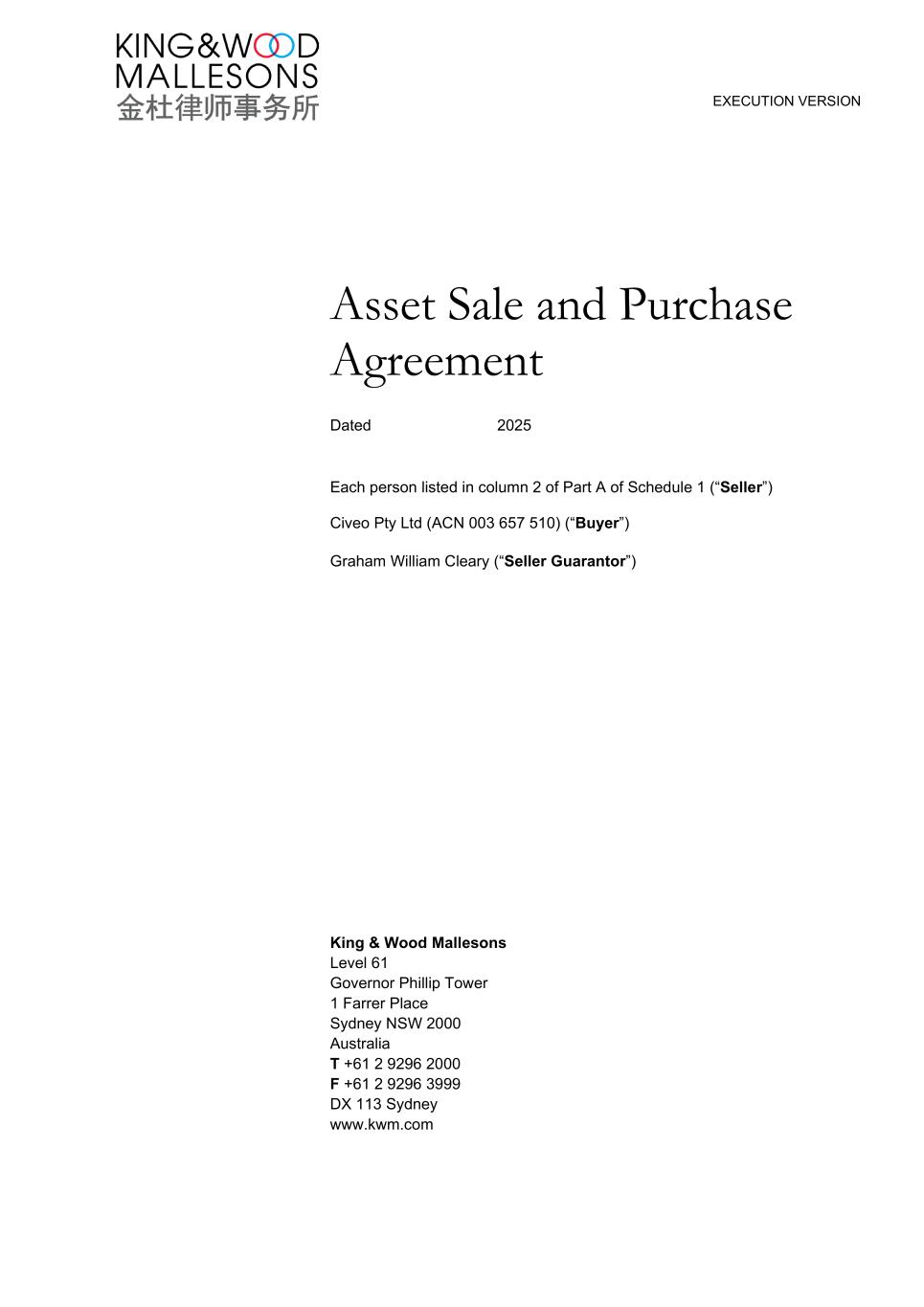 EXECUTION VERSION Asset Sale and Purchase Agreement Dated 2025 Each person listed in column 2 of Part A of Schedule 1 (“Seller”) Civeo Pty Ltd (ACN 003 657 510) (“Buyer”) Graham William Cleary (“Seller Guarantor”) King & Wood Mallesons Level 61 Governor Phillip Tower 1 Farrer Place Sydney NSW 2000 Australia T +61 2 9296 2000 F +61 2 9296 3999 DX 113 Sydney www.kwm.com