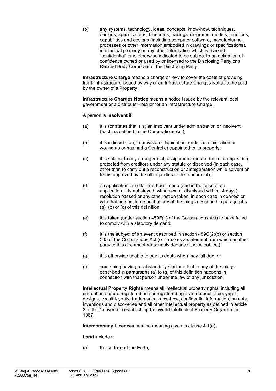 King & Wood Mallesons 72330758_14 Asset Sale and Purchase Agreement 17 February 2025 9 (b) any systems, technology, ideas, concepts, know-how, techniques, designs, specifications, blueprints, tracings, diagrams, models, functions, capabilities and designs (including computer software, manufacturing processes or other information embodied in drawings or specifications), intellectual property or any other information which is marked “confidential” or is otherwise indicated to be subject to an obligation of confidence owned or used by or licensed to the Disclosing Party or a Related Body Corporate of the Disclosing Party. Infrastructure Charge means a charge or levy to cover the costs of providing trunk infrastructure issued by way of an Infrastructure Charges Notice to be paid by the owner of a Property. Infrastructure Charges Notice means a notice issued by the relevant local government or a distributor-retailer for an Infrastructure Charge. A person is Insolvent if: (a) it is (or states that it is) an insolvent under administration or insolvent (each as defined in the Corporations Act); (b) it is in liquidation, in provisional liquidation, under administration or wound up or has had a Controller appointed to its property; (c) it is subject to any arrangement, assignment, moratorium or composition, protected from creditors under any statute or dissolved (in each case, other than to carry out a reconstruction or amalgamation while solvent on terms approved by the other parties to this document); (d) an application or order has been made (and in the case of an application, it is not stayed, withdrawn or dismissed within 14 days), resolution passed or any other action taken, in each case in connection with that person, in respect of any of the things described in paragraphs (a), (b) or (c) of this definition; (e) it is taken (under section 459F(1) of the Corporations Act) to have failed to comply with a statutory demand; (f) it is the subject of an event described in section 459C(2)(b) or section 585 of the Corporations Act (or it makes a statement from which another party to this document reasonably deduces it is so subject); (g) it is otherwise unable to pay its debts when they fall due; or (h) something having a substantially similar effect to any of the things described in paragraphs (a) to (g) of this definition happens in connection with that person under the law of any jurisdiction. Intellectual Property Rights means all intellectual property rights, including all current and future registered and unregistered rights in respect of copyright, designs, circuit layouts, trademarks, know-how, confidential information, patents, inventions and discoveries and all other intellectual property as defined in article 2 of the Convention establishing the World Intellectual Property Organisation 1967. Intercompany Licences has the meaning given in clause 4.1(e). Land includes: (a) the surface of the Earth;