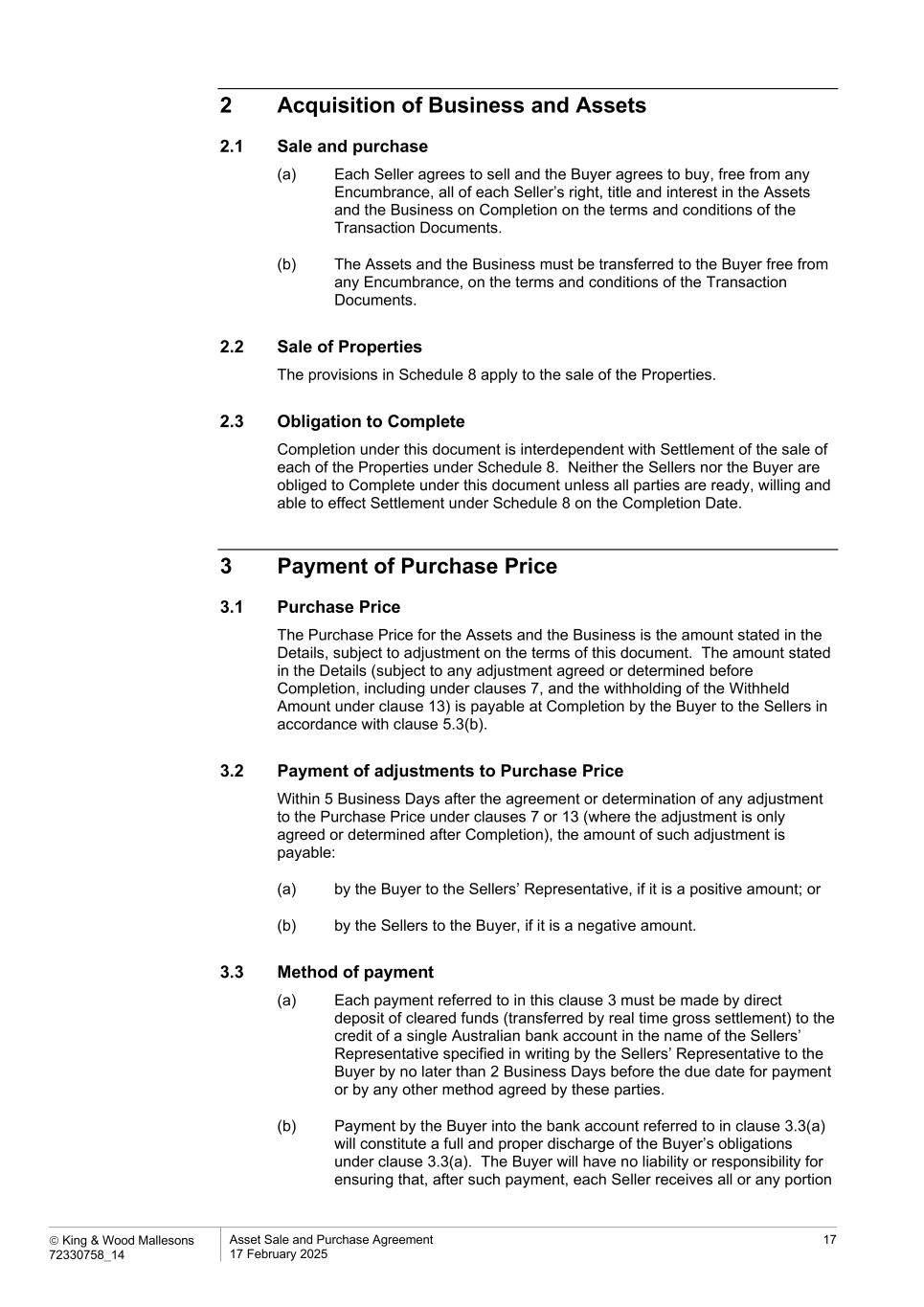 King & Wood Mallesons 72330758_14 Asset Sale and Purchase Agreement 17 February 2025 17 2 Acquisition of Business and Assets 2.1 Sale and purchase (a) Each Seller agrees to sell and the Buyer agrees to buy, free from any Encumbrance, all of each Seller’s right, title and interest in the Assets and the Business on Completion on the terms and conditions of the Transaction Documents. (b) The Assets and the Business must be transferred to the Buyer free from any Encumbrance, on the terms and conditions of the Transaction Documents. 2.2 Sale of Properties The provisions in Schedule 8 apply to the sale of the Properties. 2.3 Obligation to Complete Completion under this document is interdependent with Settlement of the sale of each of the Properties under Schedule 8. Neither the Sellers nor the Buyer are obliged to Complete under this document unless all parties are ready, willing and able to effect Settlement under Schedule 8 on the Completion Date. 3 Payment of Purchase Price 3.1 Purchase Price The Purchase Price for the Assets and the Business is the amount stated in the Details, subject to adjustment on the terms of this document. The amount stated in the Details (subject to any adjustment agreed or determined before Completion, including under clauses 7, and the withholding of the Withheld Amount under clause 13) is payable at Completion by the Buyer to the Sellers in accordance with clause 5.3(b). 3.2 Payment of adjustments to Purchase Price Within 5 Business Days after the agreement or determination of any adjustment to the Purchase Price under clauses 7 or 13 (where the adjustment is only agreed or determined after Completion), the amount of such adjustment is payable: (a) by the Buyer to the Sellers’ Representative, if it is a positive amount; or (b) by the Sellers to the Buyer, if it is a negative amount. 3.3 Method of payment (a) Each payment referred to in this clause 3 must be made by direct deposit of cleared funds (transferred by real time gross settlement) to the credit of a single Australian bank account in the name of the Sellers’ Representative specified in writing by the Sellers’ Representative to the Buyer by no later than 2 Business Days before the due date for payment or by any other method agreed by these parties. (b) Payment by the Buyer into the bank account referred to in clause 3.3(a) will constitute a full and proper discharge of the Buyer’s obligations under clause 3.3(a). The Buyer will have no liability or responsibility for ensuring that, after such payment, each Seller receives all or any portion