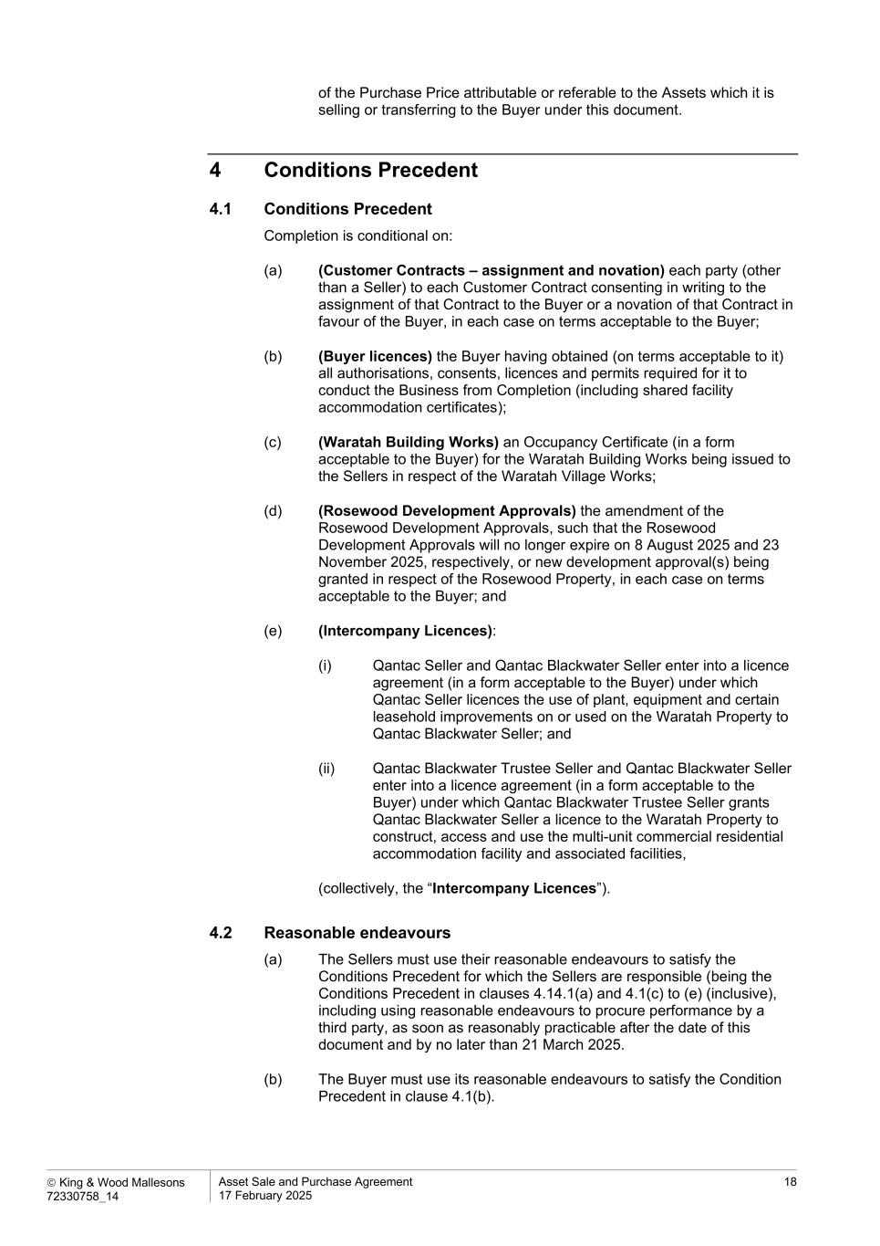 King & Wood Mallesons 72330758_14 Asset Sale and Purchase Agreement 17 February 2025 18 of the Purchase Price attributable or referable to the Assets which it is selling or transferring to the Buyer under this document. 4 Conditions Precedent 4.1 Conditions Precedent Completion is conditional on: (a) (Customer Contracts – assignment and novation) each party (other than a Seller) to each Customer Contract consenting in writing to the assignment of that Contract to the Buyer or a novation of that Contract in favour of the Buyer, in each case on terms acceptable to the Buyer; (b) (Buyer licences) the Buyer having obtained (on terms acceptable to it) all authorisations, consents, licences and permits required for it to conduct the Business from Completion (including shared facility accommodation certificates); (c) (Waratah Building Works) an Occupancy Certificate (in a form acceptable to the Buyer) for the Waratah Building Works being issued to the Sellers in respect of the Waratah Village Works; (d) (Rosewood Development Approvals) the amendment of the Rosewood Development Approvals, such that the Rosewood Development Approvals will no longer expire on 8 August 2025 and 23 November 2025, respectively, or new development approval(s) being granted in respect of the Rosewood Property, in each case on terms acceptable to the Buyer; and (e) (Intercompany Licences): (i) Qantac Seller and Qantac Blackwater Seller enter into a licence agreement (in a form acceptable to the Buyer) under which Qantac Seller licences the use of plant, equipment and certain leasehold improvements on or used on the Waratah Property to Qantac Blackwater Seller; and (ii) Qantac Blackwater Trustee Seller and Qantac Blackwater Seller enter into a licence agreement (in a form acceptable to the Buyer) under which Qantac Blackwater Trustee Seller grants Qantac Blackwater Seller a licence to the Waratah Property to construct, access and use the multi-unit commercial residential accommodation facility and associated facilities, (collectively, the “Intercompany Licences”). 4.2 Reasonable endeavours (a) The Sellers must use their reasonable endeavours to satisfy the Conditions Precedent for which the Sellers are responsible (being the Conditions Precedent in clauses 4.14.1(a) and 4.1(c) to (e) (inclusive), including using reasonable endeavours to procure performance by a third party, as soon as reasonably practicable after the date of this document and by no later than 21 March 2025. (b) The Buyer must use its reasonable endeavours to satisfy the Condition Precedent in clause 4.1(b).
