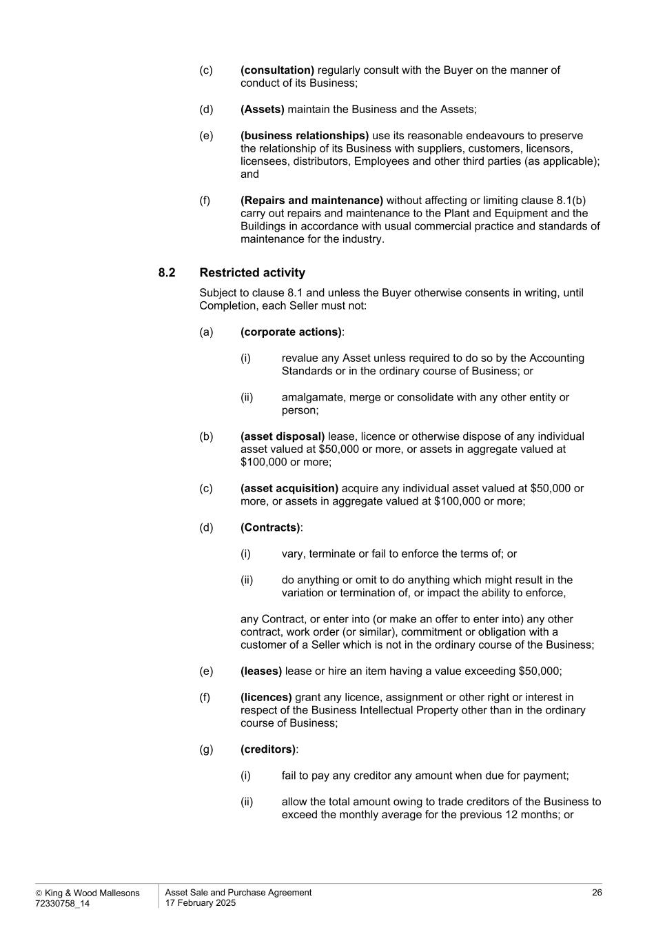 King & Wood Mallesons 72330758_14 Asset Sale and Purchase Agreement 17 February 2025 26 (c) (consultation) regularly consult with the Buyer on the manner of conduct of its Business; (d) (Assets) maintain the Business and the Assets; (e) (business relationships) use its reasonable endeavours to preserve the relationship of its Business with suppliers, customers, licensors, licensees, distributors, Employees and other third parties (as applicable); and (f) (Repairs and maintenance) without affecting or limiting clause 8.1(b) carry out repairs and maintenance to the Plant and Equipment and the Buildings in accordance with usual commercial practice and standards of maintenance for the industry. 8.2 Restricted activity Subject to clause 8.1 and unless the Buyer otherwise consents in writing, until Completion, each Seller must not: (a) (corporate actions): (i) revalue any Asset unless required to do so by the Accounting Standards or in the ordinary course of Business; or (ii) amalgamate, merge or consolidate with any other entity or person; (b) (asset disposal) lease, licence or otherwise dispose of any individual asset valued at $50,000 or more, or assets in aggregate valued at $100,000 or more; (c) (asset acquisition) acquire any individual asset valued at $50,000 or more, or assets in aggregate valued at $100,000 or more; (d) (Contracts): (i) vary, terminate or fail to enforce the terms of; or (ii) do anything or omit to do anything which might result in the variation or termination of, or impact the ability to enforce, any Contract, or enter into (or make an offer to enter into) any other contract, work order (or similar), commitment or obligation with a customer of a Seller which is not in the ordinary course of the Business; (e) (leases) lease or hire an item having a value exceeding $50,000; (f) (licences) grant any licence, assignment or other right or interest in respect of the Business Intellectual Property other than in the ordinary course of Business; (g) (creditors): (i) fail to pay any creditor any amount when due for payment; (ii) allow the total amount owing to trade creditors of the Business to exceed the monthly average for the previous 12 months; or