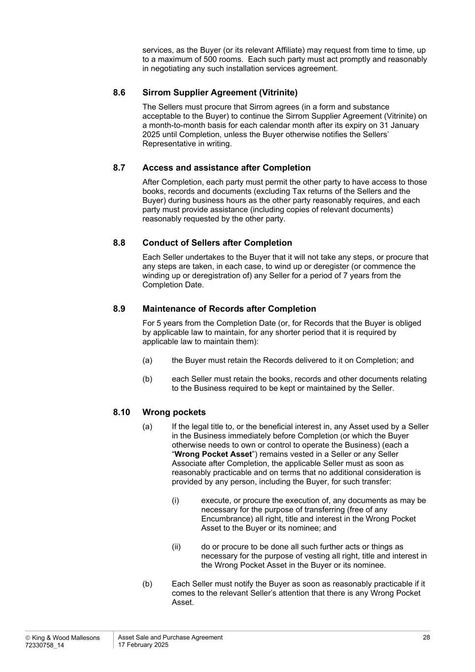King & Wood Mallesons 72330758_14 Asset Sale and Purchase Agreement 17 February 2025 28 services, as the Buyer (or its relevant Affiliate) may request from time to time, up to a maximum of 500 rooms. Each such party must act promptly and reasonably in negotiating any such installation services agreement. 8.6 Sirrom Supplier Agreement (Vitrinite) The Sellers must procure that Sirrom agrees (in a form and substance acceptable to the Buyer) to continue the Sirrom Supplier Agreement (Vitrinite) on a month-to-month basis for each calendar month after its expiry on 31 January 2025 until Completion, unless the Buyer otherwise notifies the Sellers’ Representative in writing. 8.7 Access and assistance after Completion After Completion, each party must permit the other party to have access to those books, records and documents (excluding Tax returns of the Sellers and the Buyer) during business hours as the other party reasonably requires, and each party must provide assistance (including copies of relevant documents) reasonably requested by the other party. 8.8 Conduct of Sellers after Completion Each Seller undertakes to the Buyer that it will not take any steps, or procure that any steps are taken, in each case, to wind up or deregister (or commence the winding up or deregistration of) any Seller for a period of 7 years from the Completion Date. 8.9 Maintenance of Records after Completion For 5 years from the Completion Date (or, for Records that the Buyer is obliged by applicable law to maintain, for any shorter period that it is required by applicable law to maintain them): (a) the Buyer must retain the Records delivered to it on Completion; and (b) each Seller must retain the books, records and other documents relating to the Business required to be kept or maintained by the Seller. 8.10 Wrong pockets (a) If the legal title to, or the beneficial interest in, any Asset used by a Seller in the Business immediately before Completion (or which the Buyer otherwise needs to own or control to operate the Business) (each a “Wrong Pocket Asset”) remains vested in a Seller or any Seller Associate after Completion, the applicable Seller must as soon as reasonably practicable and on terms that no additional consideration is provided by any person, including the Buyer, for such transfer: (i) execute, or procure the execution of, any documents as may be necessary for the purpose of transferring (free of any Encumbrance) all right, title and interest in the Wrong Pocket Asset to the Buyer or its nominee; and (ii) do or procure to be done all such further acts or things as necessary for the purpose of vesting all right, title and interest in the Wrong Pocket Asset in the Buyer or its nominee. (b) Each Seller must notify the Buyer as soon as reasonably practicable if it comes to the relevant Seller’s attention that there is any Wrong Pocket Asset.