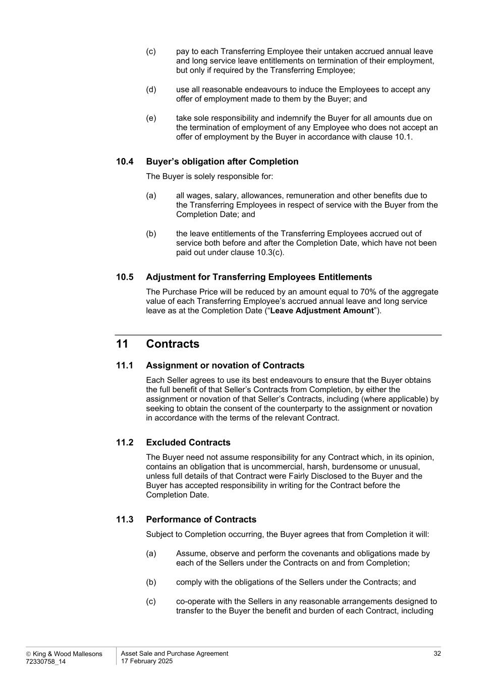 King & Wood Mallesons 72330758_14 Asset Sale and Purchase Agreement 17 February 2025 32 (c) pay to each Transferring Employee their untaken accrued annual leave and long service leave entitlements on termination of their employment, but only if required by the Transferring Employee; (d) use all reasonable endeavours to induce the Employees to accept any offer of employment made to them by the Buyer; and (e) take sole responsibility and indemnify the Buyer for all amounts due on the termination of employment of any Employee who does not accept an offer of employment by the Buyer in accordance with clause 10.1. 10.4 Buyer’s obligation after Completion The Buyer is solely responsible for: (a) all wages, salary, allowances, remuneration and other benefits due to the Transferring Employees in respect of service with the Buyer from the Completion Date; and (b) the leave entitlements of the Transferring Employees accrued out of service both before and after the Completion Date, which have not been paid out under clause 10.3(c). 10.5 Adjustment for Transferring Employees Entitlements The Purchase Price will be reduced by an amount equal to 70% of the aggregate value of each Transferring Employee’s accrued annual leave and long service leave as at the Completion Date (“Leave Adjustment Amount”). 11 Contracts 11.1 Assignment or novation of Contracts Each Seller agrees to use its best endeavours to ensure that the Buyer obtains the full benefit of that Seller’s Contracts from Completion, by either the assignment or novation of that Seller’s Contracts, including (where applicable) by seeking to obtain the consent of the counterparty to the assignment or novation in accordance with the terms of the relevant Contract. 11.2 Excluded Contracts The Buyer need not assume responsibility for any Contract which, in its opinion, contains an obligation that is uncommercial, harsh, burdensome or unusual, unless full details of that Contract were Fairly Disclosed to the Buyer and the Buyer has accepted responsibility in writing for the Contract before the Completion Date. 11.3 Performance of Contracts Subject to Completion occurring, the Buyer agrees that from Completion it will: (a) Assume, observe and perform the covenants and obligations made by each of the Sellers under the Contracts on and from Completion; (b) comply with the obligations of the Sellers under the Contracts; and (c) co-operate with the Sellers in any reasonable arrangements designed to transfer to the Buyer the benefit and burden of each Contract, including