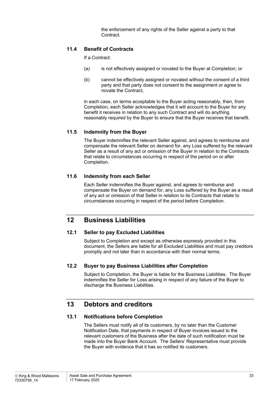 King & Wood Mallesons 72330758_14 Asset Sale and Purchase Agreement 17 February 2025 33 the enforcement of any rights of the Seller against a party to that Contract. 11.4 Benefit of Contracts If a Contract: (a) is not effectively assigned or novated to the Buyer at Completion; or (b) cannot be effectively assigned or novated without the consent of a third party and that party does not consent to the assignment or agree to novate the Contract, in each case, on terms acceptable to the Buyer acting reasonably, then, from Completion, each Seller acknowledges that it will account to the Buyer for any benefit it receives in relation to any such Contract and will do anything reasonably required by the Buyer to ensure that the Buyer receives that benefit. 11.5 Indemnity from the Buyer The Buyer indemnifies the relevant Seller against, and agrees to reimburse and compensate the relevant Seller on demand for, any Loss suffered by the relevant Seller as a result of any act or omission of the Buyer in relation to the Contracts that relate to circumstances occurring in respect of the period on or after Completion. 11.6 Indemnity from each Seller Each Seller indemnifies the Buyer against, and agrees to reimburse and compensate the Buyer on demand for, any Loss suffered by the Buyer as a result of any act or omission of that Seller in relation to its Contracts that relate to circumstances occurring in respect of the period before Completion. 12 Business Liabilities 12.1 Seller to pay Excluded Liabilities Subject to Completion and except as otherwise expressly provided in this document, the Sellers are liable for all Excluded Liabilities and must pay creditors promptly and not later than in accordance with their normal terms. 12.2 Buyer to pay Business Liabilities after Completion Subject to Completion, the Buyer is liable for the Business Liabilities. The Buyer indemnifies the Seller for Loss arising in respect of any failure of the Buyer to discharge the Business Liabilities. 13 Debtors and creditors 13.1 Notifications before Completion The Sellers must notify all of its customers, by no later than the Customer Notification Date, that payments in respect of Buyer invoices issued to the relevant customers of the Business after the date of such notification must be made into the Buyer Bank Account. The Sellers’ Representative must provide the Buyer with evidence that it has so notified its customers.
