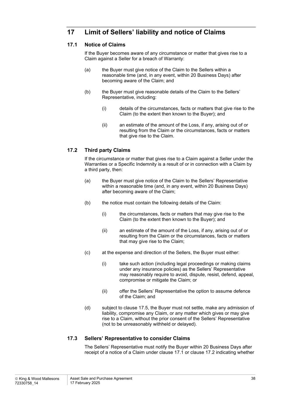 King & Wood Mallesons 72330758_14 Asset Sale and Purchase Agreement 17 February 2025 38 17 Limit of Sellers’ liability and notice of Claims 17.1 Notice of Claims If the Buyer becomes aware of any circumstance or matter that gives rise to a Claim against a Seller for a breach of Warranty: (a) the Buyer must give notice of the Claim to the Sellers within a reasonable time (and, in any event, within 20 Business Days) after becoming aware of the Claim; and (b) the Buyer must give reasonable details of the Claim to the Sellers’ Representative, including: (i) details of the circumstances, facts or matters that give rise to the Claim (to the extent then known to the Buyer); and (ii) an estimate of the amount of the Loss, if any, arising out of or resulting from the Claim or the circumstances, facts or matters that give rise to the Claim. 17.2 Third party Claims If the circumstance or matter that gives rise to a Claim against a Seller under the Warranties or a Specific Indemnity is a result of or in connection with a Claim by a third party, then: (a) the Buyer must give notice of the Claim to the Sellers’ Representative within a reasonable time (and, in any event, within 20 Business Days) after becoming aware of the Claim; (b) the notice must contain the following details of the Claim: (i) the circumstances, facts or matters that may give rise to the Claim (to the extent then known to the Buyer); and (ii) an estimate of the amount of the Loss, if any, arising out of or resulting from the Claim or the circumstances, facts or matters that may give rise to the Claim; (c) at the expense and direction of the Sellers, the Buyer must either: (i) take such action (including legal proceedings or making claims under any insurance policies) as the Sellers’ Representative may reasonably require to avoid, dispute, resist, defend, appeal, compromise or mitigate the Claim; or (ii) offer the Sellers’ Representative the option to assume defence of the Claim; and (d) subject to clause 17.5, the Buyer must not settle, make any admission of liability, compromise any Claim, or any matter which gives or may give rise to a Claim, without the prior consent of the Sellers’ Representative (not to be unreasonably withheld or delayed). 17.3 Sellers’ Representative to consider Claims The Sellers’ Representative must notify the Buyer within 20 Business Days after receipt of a notice of a Claim under clause 17.1 or clause 17.2 indicating whether
