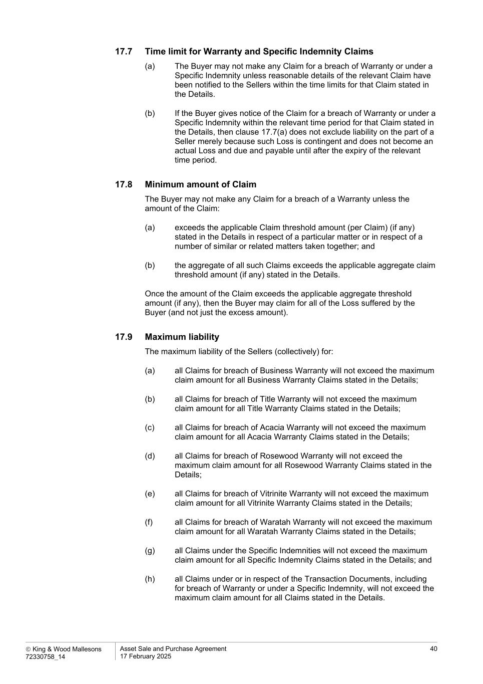 King & Wood Mallesons 72330758_14 Asset Sale and Purchase Agreement 17 February 2025 40 17.7 Time limit for Warranty and Specific Indemnity Claims (a) The Buyer may not make any Claim for a breach of Warranty or under a Specific Indemnity unless reasonable details of the relevant Claim have been notified to the Sellers within the time limits for that Claim stated in the Details. (b) If the Buyer gives notice of the Claim for a breach of Warranty or under a Specific Indemnity within the relevant time period for that Claim stated in the Details, then clause 17.7(a) does not exclude liability on the part of a Seller merely because such Loss is contingent and does not become an actual Loss and due and payable until after the expiry of the relevant time period. 17.8 Minimum amount of Claim The Buyer may not make any Claim for a breach of a Warranty unless the amount of the Claim: (a) exceeds the applicable Claim threshold amount (per Claim) (if any) stated in the Details in respect of a particular matter or in respect of a number of similar or related matters taken together; and (b) the aggregate of all such Claims exceeds the applicable aggregate claim threshold amount (if any) stated in the Details. Once the amount of the Claim exceeds the applicable aggregate threshold amount (if any), then the Buyer may claim for all of the Loss suffered by the Buyer (and not just the excess amount). 17.9 Maximum liability The maximum liability of the Sellers (collectively) for: (a) all Claims for breach of Business Warranty will not exceed the maximum claim amount for all Business Warranty Claims stated in the Details; (b) all Claims for breach of Title Warranty will not exceed the maximum claim amount for all Title Warranty Claims stated in the Details; (c) all Claims for breach of Acacia Warranty will not exceed the maximum claim amount for all Acacia Warranty Claims stated in the Details; (d) all Claims for breach of Rosewood Warranty will not exceed the maximum claim amount for all Rosewood Warranty Claims stated in the Details; (e) all Claims for breach of Vitrinite Warranty will not exceed the maximum claim amount for all Vitrinite Warranty Claims stated in the Details; (f) all Claims for breach of Waratah Warranty will not exceed the maximum claim amount for all Waratah Warranty Claims stated in the Details; (g) all Claims under the Specific Indemnities will not exceed the maximum claim amount for all Specific Indemnity Claims stated in the Details; and (h) all Claims under or in respect of the Transaction Documents, including for breach of Warranty or under a Specific Indemnity, will not exceed the maximum claim amount for all Claims stated in the Details.