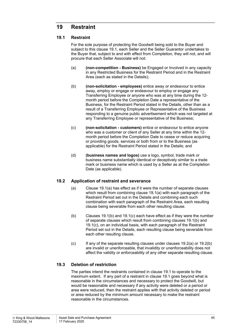 King & Wood Mallesons 72330758_14 Asset Sale and Purchase Agreement 17 February 2025 45 19 Restraint 19.1 Restraint For the sole purpose of protecting the Goodwill being sold to the Buyer and subject to this clause 19.1, each Seller and the Seller Guarantor undertakes to the Buyer that, subject to and with effect from Completion, they will not, and will procure that each Seller Associate will not: (a) (non-competition - Business) be Engaged or Involved in any capacity in any Restricted Business for the Restraint Period and in the Restraint Area (each as stated in the Details); (b) (non-solicitation - employees) entice away or endeavour to entice away, employ or engage or endeavour to employ or engage any Transferring Employee or anyone who was at any time during the 12- month period before the Completion Date a representative of the Business, for the Restraint Period stated in the Details, other than as a result of a Transferring Employee or Representative of the Business responding to a genuine public advertisement which was not targeted at any Transferring Employee or representative of the Business; (c) (non-solicitation - customers) entice or endeavour to entice anyone who was a customer or client of any Seller at any time within the 12- month period before the Completion Date to cease or reduce acquiring or providing goods, services or both from or to the Business (as applicable) for the Restraint Period stated in the Details; and (d) (business names and logos) use a logo, symbol, trade mark or business name substantially identical or deceptively similar to a trade mark or business name which is used by a Seller as at the Completion Date (as applicable). 19.2 Application of restraint and severance (a) Clause 19.1(a) has effect as if it were the number of separate clauses which result from combining clause 19.1(a) with each paragraph of the Restraint Period set out in the Details and combining each such combination with each paragraph of the Restraint Area, each resulting clause being severable from each other resulting clause. (b) Clauses 19.1(b) and 19.1(c) each have effect as if they were the number of separate clauses which result from combining clauses 19.1(b) and 19.1(c), on an individual basis, with each paragraph of the Restraint Period set out in the Details, each resulting clause being severable from each other resulting clause. (c) If any of the separate resulting clauses under clauses 19.2(a) or 19.2(b) are invalid or unenforceable, that invalidity or unenforceability does not affect the validity or enforceability of any other separate resulting clause. 19.3 Deletion of restriction The parties intend the restraints contained in clause 19.1 to operate to the maximum extent. If any part of a restraint in clause 19.1 goes beyond what is reasonable in the circumstances and necessary to protect the Goodwill, but would be reasonable and necessary if any activity were deleted or a period or area were reduced, then the restraint applies with that activity deleted or period or area reduced by the minimum amount necessary to make the restraint reasonable in the circumstances.