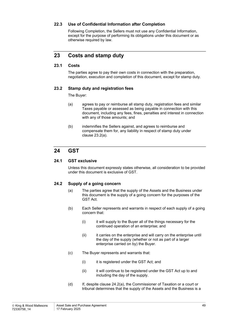 King & Wood Mallesons 72330758_14 Asset Sale and Purchase Agreement 17 February 2025 49 22.3 Use of Confidential Information after Completion Following Completion, the Sellers must not use any Confidential Information, except for the purpose of performing its obligations under this document or as otherwise required by law. 23 Costs and stamp duty 23.1 Costs The parties agree to pay their own costs in connection with the preparation, negotiation, execution and completion of this document, except for stamp duty. 23.2 Stamp duty and registration fees The Buyer: (a) agrees to pay or reimburse all stamp duty, registration fees and similar Taxes payable or assessed as being payable in connection with this document, including any fees, fines, penalties and interest in connection with any of those amounts; and (b) indemnifies the Sellers against, and agrees to reimburse and compensate them for, any liability in respect of stamp duty under clause 23.2(a). 24 GST 24.1 GST exclusive Unless this document expressly states otherwise, all consideration to be provided under this document is exclusive of GST. 24.2 Supply of a going concern (a) The parties agree that the supply of the Assets and the Business under this document is the supply of a going concern for the purposes of the GST Act. (b) Each Seller represents and warrants in respect of each supply of a going concern that: (i) it will supply to the Buyer all of the things necessary for the continued operation of an enterprise; and (ii) it carries on the enterprise and will carry on the enterprise until the day of the supply (whether or not as part of a larger enterprise carried on by) the Buyer. (c) The Buyer represents and warrants that: (i) it is registered under the GST Act; and (ii) it will continue to be registered under the GST Act up to and including the day of the supply. (d) If, despite clause 24.2(a), the Commissioner of Taxation or a court or tribunal determines that the supply of the Assets and the Business is a