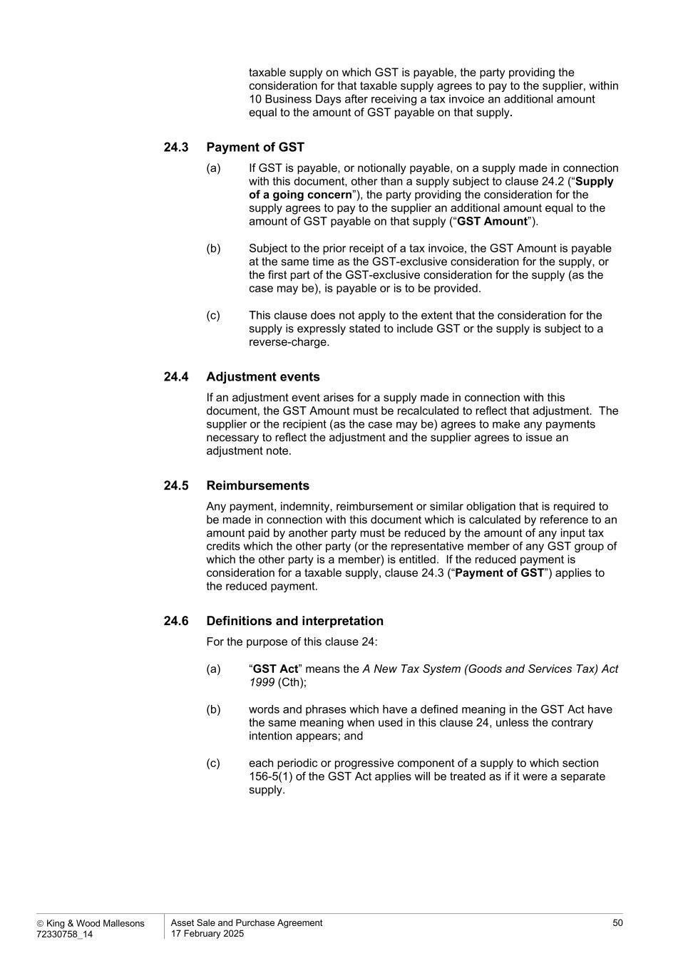 King & Wood Mallesons 72330758_14 Asset Sale and Purchase Agreement 17 February 2025 50 taxable supply on which GST is payable, the party providing the consideration for that taxable supply agrees to pay to the supplier, within 10 Business Days after receiving a tax invoice an additional amount equal to the amount of GST payable on that supply. 24.3 Payment of GST (a) If GST is payable, or notionally payable, on a supply made in connection with this document, other than a supply subject to clause 24.2 (“Supply of a going concern”), the party providing the consideration for the supply agrees to pay to the supplier an additional amount equal to the amount of GST payable on that supply (“GST Amount”). (b) Subject to the prior receipt of a tax invoice, the GST Amount is payable at the same time as the GST-exclusive consideration for the supply, or the first part of the GST-exclusive consideration for the supply (as the case may be), is payable or is to be provided. (c) This clause does not apply to the extent that the consideration for the supply is expressly stated to include GST or the supply is subject to a reverse-charge. 24.4 Adjustment events If an adjustment event arises for a supply made in connection with this document, the GST Amount must be recalculated to reflect that adjustment. The supplier or the recipient (as the case may be) agrees to make any payments necessary to reflect the adjustment and the supplier agrees to issue an adjustment note. 24.5 Reimbursements Any payment, indemnity, reimbursement or similar obligation that is required to be made in connection with this document which is calculated by reference to an amount paid by another party must be reduced by the amount of any input tax credits which the other party (or the representative member of any GST group of which the other party is a member) is entitled. If the reduced payment is consideration for a taxable supply, clause 24.3 (“Payment of GST”) applies to the reduced payment. 24.6 Definitions and interpretation For the purpose of this clause 24: (a) “GST Act” means the A New Tax System (Goods and Services Tax) Act 1999 (Cth); (b) words and phrases which have a defined meaning in the GST Act have the same meaning when used in this clause 24, unless the contrary intention appears; and (c) each periodic or progressive component of a supply to which section 156-5(1) of the GST Act applies will be treated as if it were a separate supply.