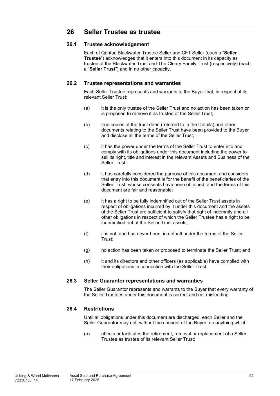 King & Wood Mallesons 72330758_14 Asset Sale and Purchase Agreement 17 February 2025 52 26 Seller Trustee as trustee 26.1 Trustee acknowledgement Each of Qantac Blackwater Trustee Seller and CFT Seller (each a “Seller Trustee”) acknowledges that it enters into this document in its capacity as trustee of the Blackwater Trust and The Cleary Family Trust (respectively) (each a “Seller Trust”) and in no other capacity. 26.2 Trustee representations and warranties Each Seller Trustee represents and warrants to the Buyer that, in respect of its relevant Seller Trust: (a) it is the only trustee of the Seller Trust and no action has been taken or is proposed to remove it as trustee of the Seller Trust; (b) true copies of the trust deed (referred to in the Details) and other documents relating to the Seller Trust have been provided to the Buyer and disclose all the terms of the Seller Trust; (c) it has the power under the terms of the Seller Trust to enter into and comply with its obligations under this document including the power to sell its right, title and interest in the relevant Assets and Business of the Seller Trust; (d) it has carefully considered the purpose of this document and considers that entry into this document is for the benefit of the beneficiaries of the Seller Trust, whose consents have been obtained, and the terms of this document are fair and reasonable; (e) it has a right to be fully indemnified out of the Seller Trust assets in respect of obligations incurred by it under this document and the assets of the Seller Trust are sufficient to satisfy that right of indemnity and all other obligations in respect of which the Seller Trustee has a right to be indemnified out of the Seller Trust assets; (f) it is not, and has never been, in default under the terms of the Seller Trust; (g) no action has been taken or proposed to terminate the Seller Trust; and (h) it and its directors and other officers (as applicable) have complied with their obligations in connection with the Seller Trust. 26.3 Seller Guarantor representations and warranties The Seller Guarantor represents and warrants to the Buyer that every warranty of the Seller Trustees under this document is correct and not misleading. 26.4 Restrictions Until all obligations under this document are discharged, each Seller and the Seller Guarantor may not, without the consent of the Buyer, do anything which: (a) effects or facilitates the retirement, removal or replacement of a Seller Trustee as trustee of its relevant Seller Trust;