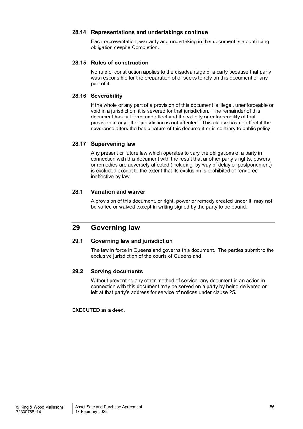 King & Wood Mallesons 72330758_14 Asset Sale and Purchase Agreement 17 February 2025 56 28.14 Representations and undertakings continue Each representation, warranty and undertaking in this document is a continuing obligation despite Completion. 28.15 Rules of construction No rule of construction applies to the disadvantage of a party because that party was responsible for the preparation of or seeks to rely on this document or any part of it. 28.16 Severability If the whole or any part of a provision of this document is illegal, unenforceable or void in a jurisdiction, it is severed for that jurisdiction. The remainder of this document has full force and effect and the validity or enforceability of that provision in any other jurisdiction is not affected. This clause has no effect if the severance alters the basic nature of this document or is contrary to public policy. 28.17 Supervening law Any present or future law which operates to vary the obligations of a party in connection with this document with the result that another party’s rights, powers or remedies are adversely affected (including, by way of delay or postponement) is excluded except to the extent that its exclusion is prohibited or rendered ineffective by law. 28.1 Variation and waiver A provision of this document, or right, power or remedy created under it, may not be varied or waived except in writing signed by the party to be bound. 29 Governing law 29.1 Governing law and jurisdiction The law in force in Queensland governs this document. The parties submit to the exclusive jurisdiction of the courts of Queensland. 29.2 Serving documents Without preventing any other method of service, any document in an action in connection with this document may be served on a party by being delivered or left at that party’s address for service of notices under clause 25. EXECUTED as a deed.