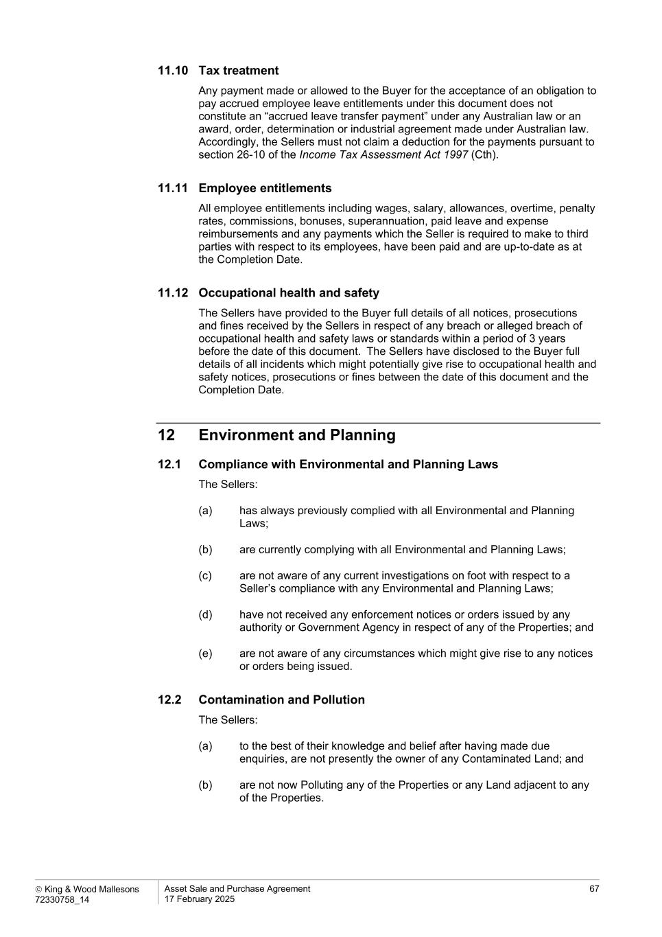 King & Wood Mallesons 72330758_14 Asset Sale and Purchase Agreement 17 February 2025 67 11.10 Tax treatment Any payment made or allowed to the Buyer for the acceptance of an obligation to pay accrued employee leave entitlements under this document does not constitute an “accrued leave transfer payment” under any Australian law or an award, order, determination or industrial agreement made under Australian law. Accordingly, the Sellers must not claim a deduction for the payments pursuant to section 26-10 of the Income Tax Assessment Act 1997 (Cth). 11.11 Employee entitlements All employee entitlements including wages, salary, allowances, overtime, penalty rates, commissions, bonuses, superannuation, paid leave and expense reimbursements and any payments which the Seller is required to make to third parties with respect to its employees, have been paid and are up-to-date as at the Completion Date. 11.12 Occupational health and safety The Sellers have provided to the Buyer full details of all notices, prosecutions and fines received by the Sellers in respect of any breach or alleged breach of occupational health and safety laws or standards within a period of 3 years before the date of this document. The Sellers have disclosed to the Buyer full details of all incidents which might potentially give rise to occupational health and safety notices, prosecutions or fines between the date of this document and the Completion Date. 12 Environment and Planning 12.1 Compliance with Environmental and Planning Laws The Sellers: (a) has always previously complied with all Environmental and Planning Laws; (b) are currently complying with all Environmental and Planning Laws; (c) are not aware of any current investigations on foot with respect to a Seller’s compliance with any Environmental and Planning Laws; (d) have not received any enforcement notices or orders issued by any authority or Government Agency in respect of any of the Properties; and (e) are not aware of any circumstances which might give rise to any notices or orders being issued. 12.2 Contamination and Pollution The Sellers: (a) to the best of their knowledge and belief after having made due enquiries, are not presently the owner of any Contaminated Land; and (b) are not now Polluting any of the Properties or any Land adjacent to any of the Properties.