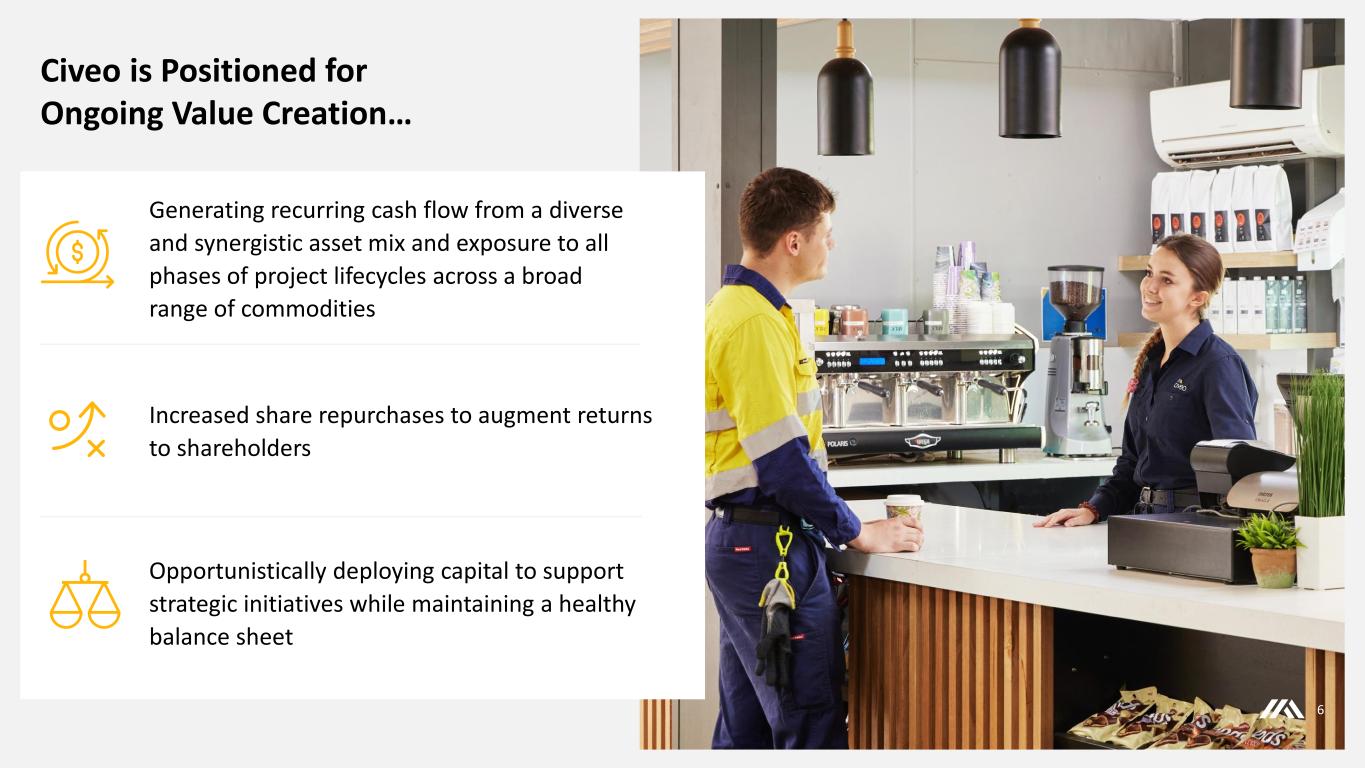 5 Operating Two Scaled Platforms with Distinct and Differentiated Value Drivers AUSTRALIA Owned Villages (or “COV” business) • High-margin, high-cash flow business with recurring revenue streams largely backed by take-or-pay contracts • Network effect: Portfolio of locations can serve multiple customer projects at multiple Civeo locations with consistent service levels • Low maintenance capital intensity for existing assets Integrated Services (or “CIS”) • Established owned villages footprint provides natural, synergistic growth platform for CIS • Minimal capital intensity for existing operations; minimal investment required to support growth • Regionally diversified across Australia • Strong growth momentum built on recent key contract wins • Compelling valuation in stand-alone scenarios ([7-13x EV/FY+1 EBITDA](1)) • Opportunity to expand into non-natural resource end markets CANADA Owned Lodges • Leading market position in the Canadian oil sands • Low maintenance capital intensity for existing assets • Significant operating leverage as occupancy recovers • Significant exposure to potential carbon capture projects such as the Pathways Alliance Mobile Camps • Over 2,500² rooms of mobile camp assets with support assets (kitchens, corridors, utility assets) • Ideally suited for infrastructure construction projects (pipelines, LNG, power transmission, data centers) • Significant federal and provincial support for Canadian infrastructure investment Integrated Services • Recently announced the launch of CiveoSix, a limited partnership with Six Nations of the Grand River Corporation, which will deliver hospitality, food services, janitorial, and property maintenance services across CanadaPlease see Appendix A for additional detail on the business segment disclosure (1) FactSet as of 7/31/25. Companies include Aramark, Compass, ISS and Sodexo (2) In addition, Civeo has 1,100 mobile camp rooms that are currently deployed within our 17,000-room lodge footprint – which can be detached and deployed on mobile camp jobs