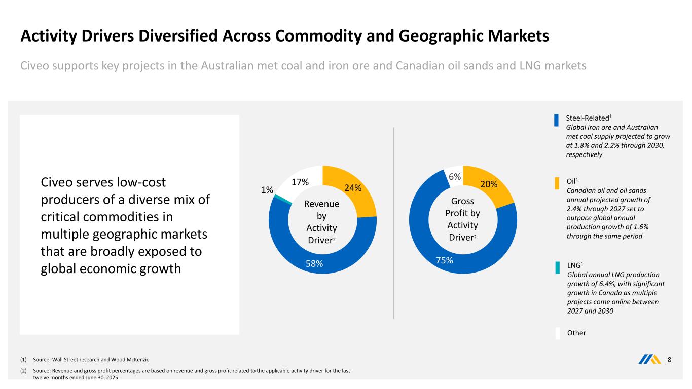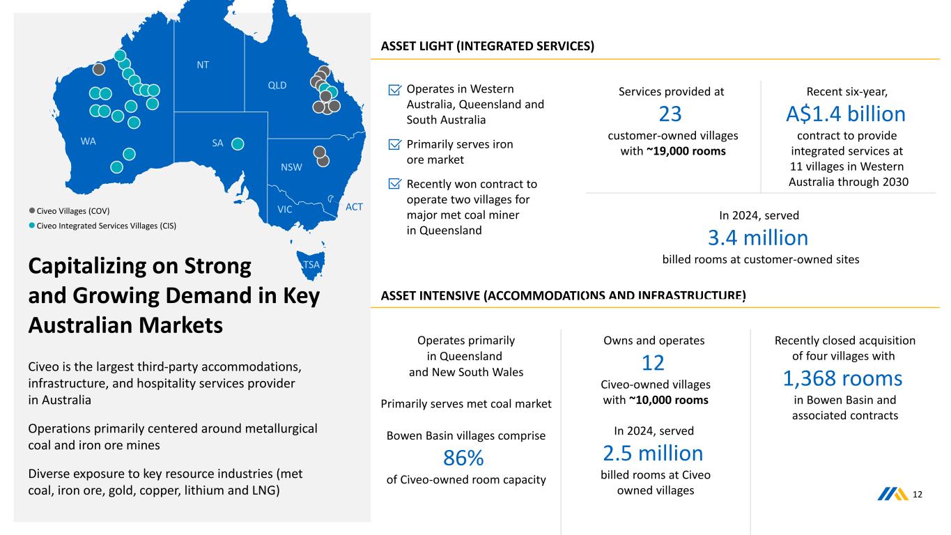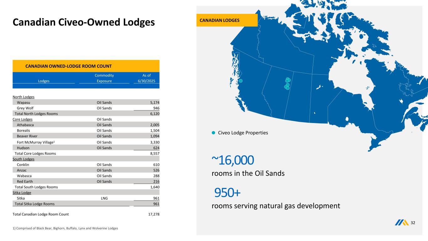 2 Forward-Looking Statements This presentation contains forward-looking statements within the meaning of the Securities Act of 1933 and Section 21E of the Securities Exchange Act of 1934. Forward-looking statements are those that do not state historical facts and are, therefore, inherently subject to risks and uncertainties. The forward-looking statements herein, including the statements regarding Civeo’s future plans and outlook, strategic priorities, guidance, current trends, expectations with respect to Adjusted EBITDA, capital expenditures, future revenues, share repurchases, free cash flow generation, cost reductions, integration of the Australian asset acquisition and liquidity needs, are based on then current expectations and entail various risks and uncertainties that could cause actual results to differ materially from those expressed or implied by these forward-looking statements. Such risks and uncertainties include, among other things, risks associated with the general nature of the accommodations industry, risks associated with the level of supply and demand for oil, coal, iron ore and other minerals, including the level of activity, spending and developments in the Canadian oil sands, the level of demand for coal and other natural resources from, and investments and opportunities in, Australia, and fluctuations or sharp declines in the current and future prices of coal, iron ore, oil, natural gas and other minerals, risks associated with failure by our customers to reach positive final investment decisions on, or otherwise not complete, projects with respect to which we have been awarded contracts, which may cause those customers to terminate or postpone contracts, risks associated with currency exchange rates, risks associated with inflation, risks associated with the company’s ability to integrate any future acquisitions, risks associated with labor shortages, risks associated with the development of new projects, including whether such projects will continue in the future, risks associated with the trading price of the company’s common shares, availability and cost of capital, risks associated with general global economic conditions, geopolitical events, inflation, global weather conditions, natural disasters, including wildfires, global health concerns, and security threats and changes to government and environmental regulations, including climate change, and other factors discussed in the “Management’s Discussion and Analysis of Financial Condition and Results of Operations” and “Risk Factors” sections of Civeo’s most recent annual report on Form 10-K and other reports the company may file from time to time with the U.S. Securities and Exchange Commission. Each forward-looking statement contained herein speaks only as of the date of this presentation. Except as required by law, Civeo expressly disclaims any intention or obligation to revise or update any forward-looking statements, whether as a result of new information, future events or otherwise. The financial and operating data presented herein is as of June 30, 2025, unless otherwise noted. Non-GAAP Financial Information EBITDA, Adjusted EBITDA, net debt, bank-adjusted EBITDA and net leverage ratio are non-GAAP financial measures. See “Non-GAAP Reconciliation” in Appendix B for definitions and additional information concerning non-GAAP financial measures, including a reconciliation of the non-GAAP financial information presented in this presentation to the most directly comparable financial information presented in accordance with GAAP. Non-GAAP financial information supplements and should be read together with, and is not an alternative or substitute for, the Company’s financial results reported in accordance with GAAP. Because non-GAAP financial information is not standardized, it may not be possible to compare these financial measures with other companies’ non-GAAP financial measures.