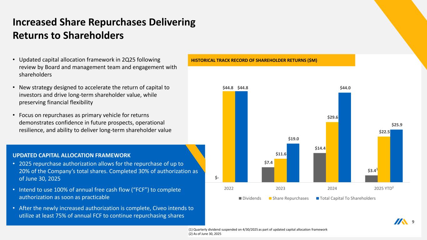 9 $- $7.4 $14.4 $3.4 $44.8 $11.6 $29.6 $22.5 $44.8 $19.0 $44.0 $25.9 2022 2023 2024 2025 YTD² Dividends Share Repurchases Total Capital To Shareholders Increased Share Repurchases Delivering Returns to Shareholders • Updated capital allocation framework in 2Q25 following review by Board and management team and engagement with shareholders • New strategy designed to accelerate the return of capital to investors and drive long-term shareholder value, while preserving financial flexibility • Focus on repurchases as primary vehicle for returns demonstrates confidence in future prospects, operational resilience, and ability to deliver long-term shareholder value UPDATED CAPITAL ALLOCATION FRAMEWORK • 2025 repurchase authorization allows for the repurchase of up to 20% of the Company’s total shares. Completed 30% of authorization as of June 30, 2025 • Intend to use 100% of annual free cash flow (“FCF”) to complete authorization as soon as practicable • After the newly increased authorization is complete, Civeo intends to utilize at least 75% of annual FCF to continue repurchasing shares HISTORICAL TRACK RECORD OF SHAREHOLDER RETURNS ($M) (1) Quarterly dividend suspended on 4/30/2025 as part of updated capital allocation framework (2) As of June 30, 2025 1