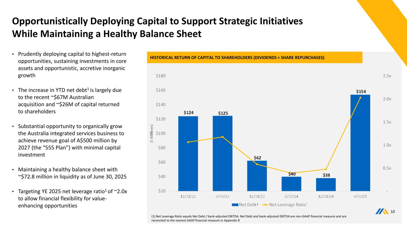 10 Opportunistically Deploying Capital to Support Strategic Initiatives While Maintaining a Healthy Balance Sheet (1) Net Leverage Ratio equals Net Debt / bank-adjusted EBITDA. Net Debt and bank-adjusted EBITDA are non-GAAP financial measure and are reconciled to the nearest GAAP financial measure in Appendix B HISTORICAL RETURN OF CAPITAL TO SHAREHOLDERS (DIVIDENDS + SHARE REPURCHASES) • Prudently deploying capital to highest-return opportunities, sustaining investments in core assets and opportunistic, accretive inorganic growth • The increase in YTD net debt1 is largely due to the recent ~$67M Australian acquisition and ~$26M of capital returned to shareholders • Substantial opportunity to organically grow the Australia integrated services business to achieve revenue goal of A$500 million by 2027 (the “555 Plan”) with minimal capital investment • Maintaining a healthy balance sheet with ~$72.8 million in liquidity as of June 30, 2025 • Targeting YE 2025 net leverage ratio1 of ~2.0x to allow financial flexibility for value- enhancing opportunities 1