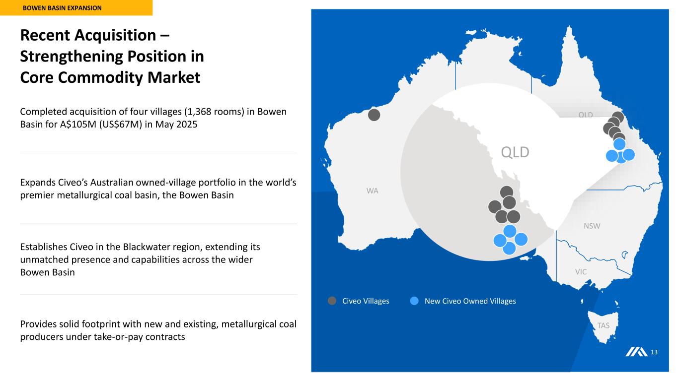 12 Capitalizing on Strong and Growing Demand in Key Australian Markets Civeo is the largest third-party accommodations, infrastructure, and hospitality services provider in Australia Operations primarily centered around metallurgical coal and iron ore mines Diverse exposure to key resource industries (met coal, iron ore, gold, copper, lithium and LNG) Operates in Western Australia, Queensland and South Australia Primarily serves iron ore market Recently won contract to operate two villages for major met coal miner in Queensland ASSET LIGHT (INTEGRATED SERVICES) ASSET INTENSIVE (ACCOMMODATIONS AND INFRASTRUCTURE) Civeo Villages (COV) Civeo Integrated Services Villages (CIS) NT QLD NSW VIC SAWA TSA ACT Services provided at 23 customer-owned villages with ~19,000 rooms Recent six-year, A$1.4 billion contract to provide integrated services at 11 villages in Western Australia through 2030 In 2024, served 3.4 million billed rooms at customer-owned sites Operates primarily in Queensland and New South Wales Primarily serves met coal market Bowen Basin villages comprise 86% of Civeo-owned room capacity Owns and operates 12 Civeo-owned villages with ~10,000 rooms In 2024, served 2.5 million billed rooms at Civeo owned villages Recently closed acquisition of four villages with 1,368 rooms in Bowen Basin and associated contracts