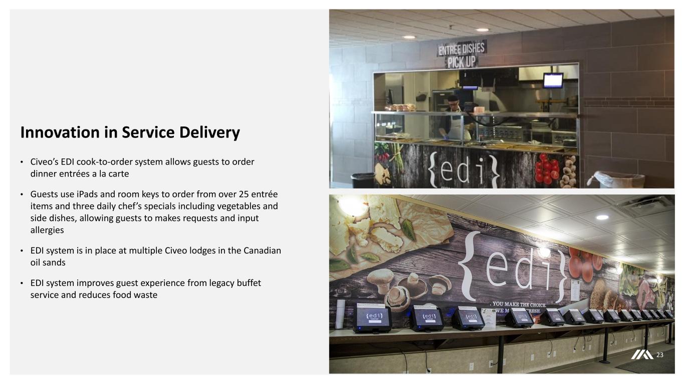 23 Innovation in Service Delivery • Civeo’s EDI cook-to-order system allows guests to order dinner entrées a la carte • Guests use iPads and room keys to order from over 25 entrée items and three daily chef’s specials including vegetables and side dishes, allowing guests to makes requests and input allergies • EDI system is in place at multiple Civeo lodges in the Canadian oil sands • EDI system improves guest experience from legacy buffet service and reduces food waste
