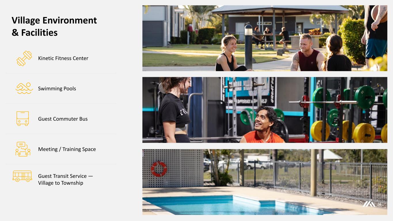 26 Village Environment & Facilities Kinetic Fitness Center Swimming Pools Guest Commuter Bus Meeting / Training Space Guest Transit Service — Village to Township