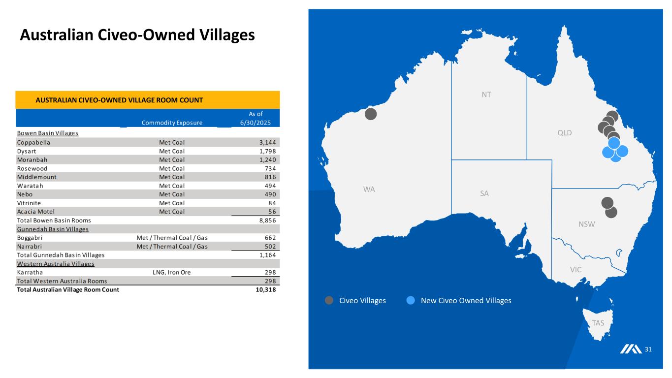 31 Australian Civeo-Owned Villages AUSTRALIAN CIVEO-OWNED VILLAGE ROOM COUNT Civeo Villages NT QLD SA NSW VIC TAS WA New Civeo Owned Villages