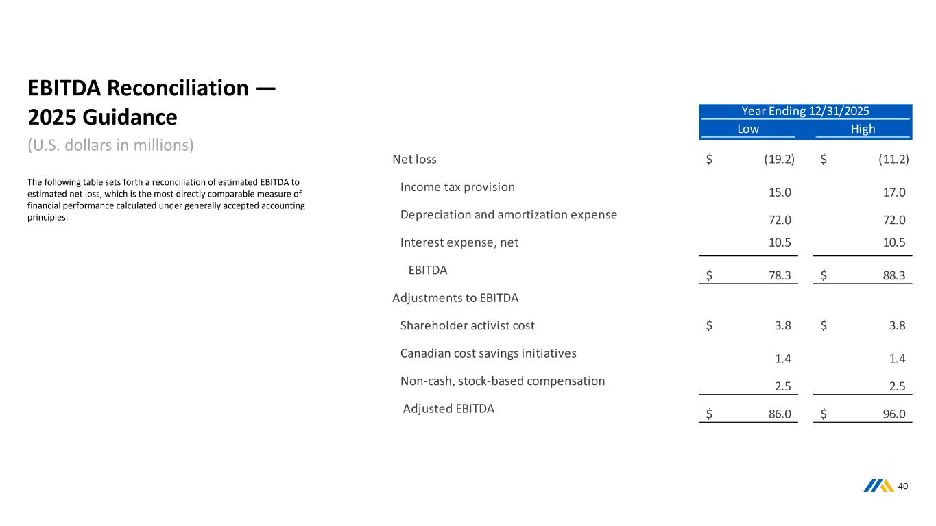 40 EBITDA Reconciliation — 2025 Guidance (U.S. dollars in millions) The following table sets forth a reconciliation of estimated EBITDA to estimated net loss, which is the most directly comparable measure of financial performance calculated under generally accepted accounting principles: Year Ending 12/31/2025 Low High Net loss (19.2)$ (11.2)$ Income tax provision 15.0 17.0 Depreciation and amortization expense 72.0 72.0 Interest expense, net 10.5 10.5 EBITDA 78.3$ 88.3$ Adjustments to EBITDA Shareholder activist cost 3.8$ 3.8$ Canadian cost savings initiatives 1.4 1.4 Non-cash, stock-based compensation 2.5 2.5 Adjusted EBITDA 86.0$ 96.0$