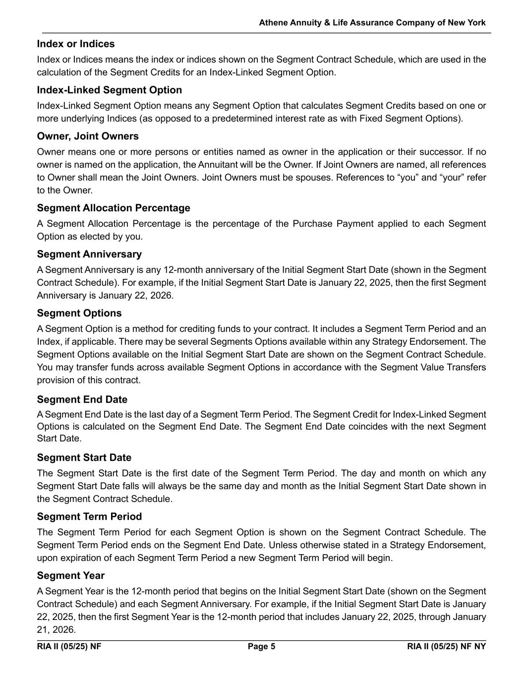 Athene Annuity & Life Assurance Company of New York RIA II (05/25) NF Page 5 RIA II (05/25) NF NY Index or Indices Index or Indices means the index or indices shown on the Segment Contract Schedule, which are used in the calculation of the Segment Credits for an Index-Linked Segment Option. Index-Linked Segment Option Index-Linked Segment Option means any Segment Option that calculates Segment Credits based on one or more underlying Indices (as opposed to a predetermined interest rate as with Fixed Segment Options). Owner, Joint Owners Owner means one or more persons or entities named as owner in the application or their successor. If no owner is named on the application, the Annuitant will be the Owner. If Joint Owners are named, all references to Owner shall mean the Joint Owners. Joint Owners must be spouses. References to “you” and “your” refer to the Owner. Segment Allocation Percentage A Segment Allocation Percentage is the percentage of the Purchase Payment applied to each Segment Option as elected by you. Segment Anniversary A Segment Anniversary is any 12-month anniversary of the Initial Segment Start Date (shown in the Segment Contract Schedule). For example, if the Initial Segment Start Date is January 22, 2025, then the first Segment Anniversary is January 22, 2026. Segment Options A Segment Option is a method for crediting funds to your contract. It includes a Segment Term Period and an Index, if applicable. There may be several Segments Options available within any Strategy Endorsement. The Segment Options available on the Initial Segment Start Date are shown on the Segment Contract Schedule. You may transfer funds across available Segment Options in accordance with the Segment Value Transfers provision of this contract. Segment End Date A Segment End Date is the last day of a Segment Term Period. The Segment Credit for Index-Linked Segment Options is calculated on the Segment End Date. The Segment End Date coincides with the next Segment Start Date. Segment Start Date The Segment Start Date is the first date of the Segment Term Period. The day and month on which any Segment Start Date falls will always be the same day and month as the Initial Segment Start Date shown in the Segment Contract Schedule. Segment Term Period The Segment Term Period for each Segment Option is shown on the Segment Contract Schedule. The Segment Term Period ends on the Segment End Date. Unless otherwise stated in a Strategy Endorsement, upon expiration of each Segment Term Period a new Segment Term Period will begin. Segment Year A Segment Year is the 12-month period that begins on the Initial Segment Start Date (shown on the Segment Contract Schedule) and each Segment Anniversary. For example, if the Initial Segment Start Date is January 22, 2025, then the first Segment Year is the 12-month period that includes January 22, 2025, through January 21, 2026.