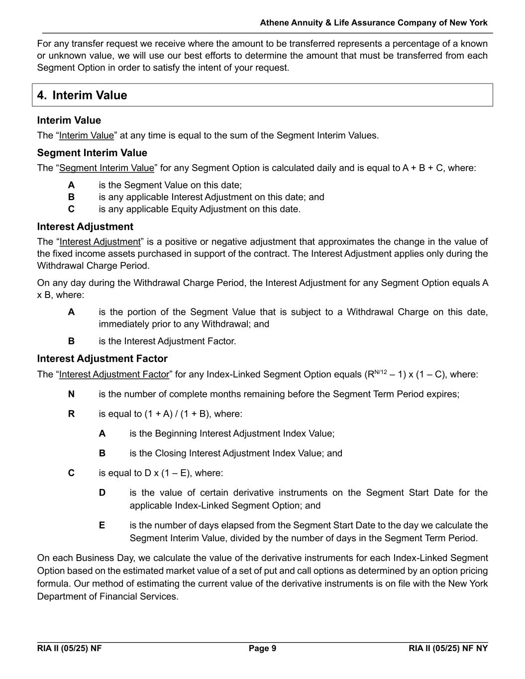 Athene Annuity & Life Assurance Company of New York RIA II (05/25) NF Page 9 RIA II (05/25) NF NY For any transfer request we receive where the amount to be transferred represents a percentage of a known or unknown value, we will use our best efforts to determine the amount that must be transferred from each Segment Option in order to satisfy the intent of your request. 4. Interim Value Interim Value The “Interim Value” at any time is equal to the sum of the Segment Interim Values. Segment Interim Value The “Segment Interim Value” for any Segment Option is calculated daily and is equal to A + B + C, where: A is the Segment Value on this date; B is any applicable Interest Adjustment on this date; and C is any applicable Equity Adjustment on this date. Interest Adjustment The “Interest Adjustment” is a positive or negative adjustment that approximates the change in the value of the fixed income assets purchased in support of the contract. The Interest Adjustment applies only during the Withdrawal Charge Period. On any day during the Withdrawal Charge Period, the Interest Adjustment for any Segment Option equals A x B, where: A is the portion of the Segment Value that is subject to a Withdrawal Charge on this date, immediately prior to any Withdrawal; and B is the Interest Adjustment Factor. Interest Adjustment Factor The “Interest Adjustment Factor” for any Index-Linked Segment Option equals (RN/12 – 1) x (1 – C), where: N is the number of complete months remaining before the Segment Term Period expires; R is equal to (1 + A) / (1 + B), where: A is the Beginning Interest Adjustment Index Value; B is the Closing Interest Adjustment Index Value; and C is equal to D x (1 – E), where: D is the value of certain derivative instruments on the Segment Start Date for the applicable Index-Linked Segment Option; and E is the number of days elapsed from the Segment Start Date to the day we calculate the Segment Interim Value, divided by the number of days in the Segment Term Period. On each Business Day, we calculate the value of the derivative instruments for each Index-Linked Segment Option based on the estimated market value of a set of put and call options as determined by an option pricing formula. Our method of estimating the current value of the derivative instruments is on file with the New York Department of Financial Services.
