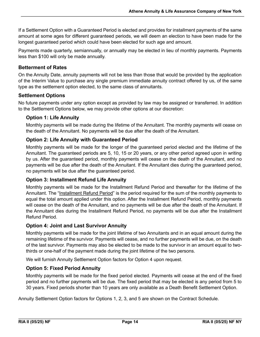 Athene Annuity & Life Assurance Company of New York RIA II (05/25) NF Page 14 RIA II (05/25) NF NY If a Settlement Option with a Guaranteed Period is elected and provides for installment payments of the same amount at some ages for different guaranteed periods, we will deem an election to have been made for the longest guaranteed period which could have been elected for such age and amount. Payments made quarterly, semiannually, or annually may be elected in lieu of monthly payments. Payments less than $100 will only be made annually. Betterment of Rates On the Annuity Date, annuity payments will not be less than those that would be provided by the application of the Interim Value to purchase any single premium immediate annuity contract offered by us, of the same type as the settlement option elected, to the same class of annuitants. Settlement Options No future payments under any option except as provided by law may be assigned or transferred. In addition to the Settlement Options below, we may provide other options at our discretion: Option 1: Life Annuity Monthly payments will be made during the lifetime of the Annuitant. The monthly payments will cease on the death of the Annuitant. No payments will be due after the death of the Annuitant. Option 2: Life Annuity with Guaranteed Period Monthly payments will be made for the longer of the guaranteed period elected and the lifetime of the Annuitant. The guaranteed periods are 5, 10, 15 or 20 years, or any other period agreed upon in writing by us. After the guaranteed period, monthly payments will cease on the death of the Annuitant, and no payments will be due after the death of the Annuitant. If the Annuitant dies during the guaranteed period, no payments will be due after the guaranteed period. Option 3: Installment Refund Life Annuity Monthly payments will be made for the Installment Refund Period and thereafter for the lifetime of the Annuitant. The “Installment Refund Period” is the period required for the sum of the monthly payments to equal the total amount applied under this option. After the Installment Refund Period, monthly payments will cease on the death of the Annuitant, and no payments will be due after the death of the Annuitant. If the Annuitant dies during the Installment Refund Period, no payments will be due after the Installment Refund Period. Option 4: Joint and Last Survivor Annuity Monthly payments will be made for the joint lifetime of two Annuitants and in an equal amount during the remaining lifetime of the survivor. Payments will cease, and no further payments will be due, on the death of the last survivor. Payments may also be elected to be made to the survivor in an amount equal to two- thirds or one-half of the payment made during the joint lifetime of the two persons. We will furnish Annuity Settlement Option factors for Option 4 upon request. Option 5: Fixed Period Annuity Monthly payments will be made for the fixed period elected. Payments will cease at the end of the fixed period and no further payments will be due. The fixed period that may be elected is any period from 5 to 30 years. Fixed periods shorter than 10 years are only available as a Death Benefit Settlement Option. Annuity Settlement Option factors for Options 1, 2, 3, and 5 are shown on the Contract Schedule.