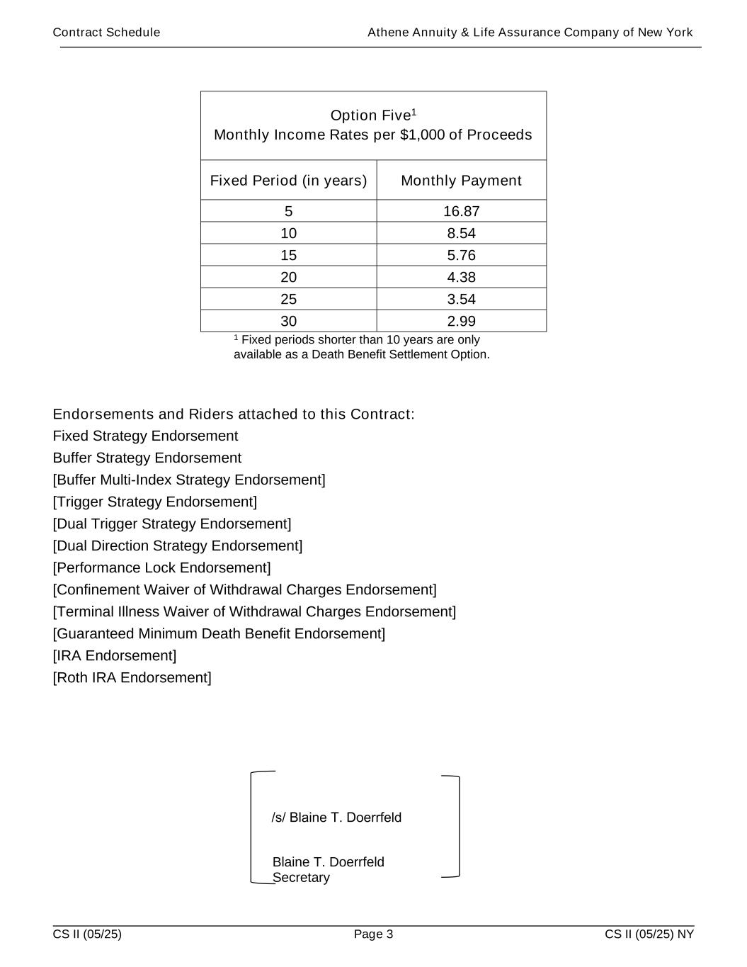 Contract Schedule Athene Annuity & Life Assurance Company of New York CS II (05/25) Page 3 CS II (05/25) NY Option Five1 Monthly Income Rates per $1,000 of Proceeds Fixed Period (in years) Monthly Payment 5 16.87 10 8.54 15 5.76 20 4.38 25 3.54 30 2.99 1 Fixed periods shorter than 10 years are only available as a Death Benefit Settlement Option. Endorsements and Riders attached to this Contract: Fixed Strategy Endorsement Buffer Strategy Endorsement [Buffer Multi-Index Strategy Endorsement] [Trigger Strategy Endorsement] [Dual Trigger Strategy Endorsement] [Dual Direction Strategy Endorsement] [Performance Lock Endorsement] [Confinement Waiver of Withdrawal Charges Endorsement] [Terminal Illness Waiver of Withdrawal Charges Endorsement] [Guaranteed Minimum Death Benefit Endorsement] [IRA Endorsement] [Roth IRA Endorsement] Blaine T. Doerrfeld Secretary /s/ Blaine T. Doerrfeld