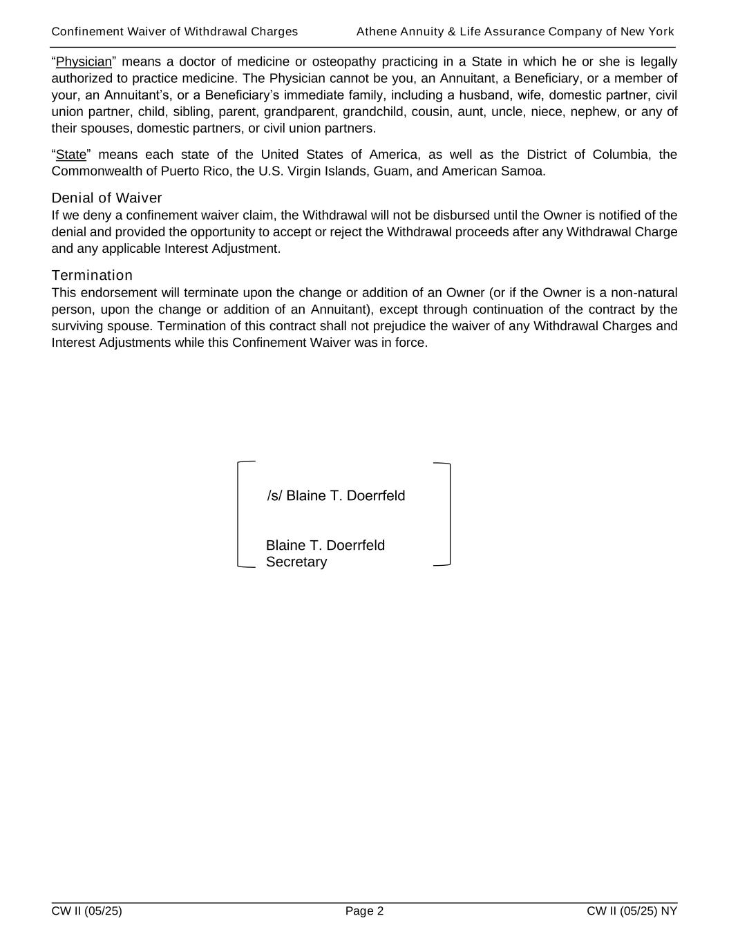 Confinement Waiver of Withdrawal Charges Athene Annuity & Life Assurance Company of New York CW II (05/25) Page 2 CW II (05/25) NY “Physician” means a doctor of medicine or osteopathy practicing in a State in which he or she is legally authorized to practice medicine. The Physician cannot be you, an Annuitant, a Beneficiary, or a member of your, an Annuitant’s, or a Beneficiary’s immediate family, including a husband, wife, domestic partner, civil union partner, child, sibling, parent, grandparent, grandchild, cousin, aunt, uncle, niece, nephew, or any of their spouses, domestic partners, or civil union partners. “State” means each state of the United States of America, as well as the District of Columbia, the Commonwealth of Puerto Rico, the U.S. Virgin Islands, Guam, and American Samoa. Denial of Waiver If we deny a confinement waiver claim, the Withdrawal will not be disbursed until the Owner is notified of the denial and provided the opportunity to accept or reject the Withdrawal proceeds after any Withdrawal Charge and any applicable Interest Adjustment. Termination This endorsement will terminate upon the change or addition of an Owner (or if the Owner is a non-natural person, upon the change or addition of an Annuitant), except through continuation of the contract by the surviving spouse. Termination of this contract shall not prejudice the waiver of any Withdrawal Charges and Interest Adjustments while this Confinement Waiver was in force. Blaine T. Doerrfeld Secretary /s/ Blaine T. Doerrfeld