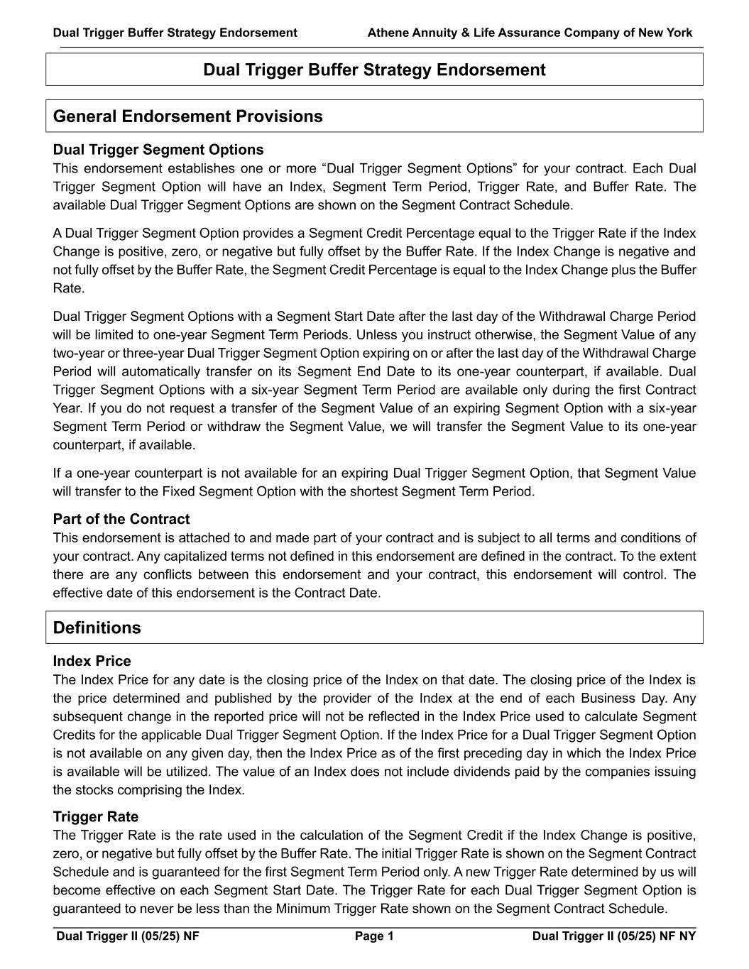 Dual Trigger Buffer Strategy Endorsement Athene Annuity & Life Assurance Company of New York Dual Trigger II (05/25) NF Page 1 Dual Trigger II (05/25) NF NY Dual Trigger Buffer Strategy Endorsement General Endorsement Provisions Dual Trigger Segment Options This endorsement establishes one or more “Dual Trigger Segment Options” for your contract. Each Dual Trigger Segment Option will have an Index, Segment Term Period, Trigger Rate, and Buffer Rate. The available Dual Trigger Segment Options are shown on the Segment Contract Schedule. A Dual Trigger Segment Option provides a Segment Credit Percentage equal to the Trigger Rate if the Index Change is positive, zero, or negative but fully offset by the Buffer Rate. If the Index Change is negative and not fully offset by the Buffer Rate, the Segment Credit Percentage is equal to the Index Change plus the Buffer Rate. Dual Trigger Segment Options with a Segment Start Date after the last day of the Withdrawal Charge Period will be limited to one-year Segment Term Periods. Unless you instruct otherwise, the Segment Value of any two-year or three-year Dual Trigger Segment Option expiring on or after the last day of the Withdrawal Charge Period will automatically transfer on its Segment End Date to its one-year counterpart, if available. Dual Trigger Segment Options with a six-year Segment Term Period are available only during the first Contract Year. If you do not request a transfer of the Segment Value of an expiring Segment Option with a six-year Segment Term Period or withdraw the Segment Value, we will transfer the Segment Value to its one-year counterpart, if available. If a one-year counterpart is not available for an expiring Dual Trigger Segment Option, that Segment Value will transfer to the Fixed Segment Option with the shortest Segment Term Period. Part of the Contract This endorsement is attached to and made part of your contract and is subject to all terms and conditions of your contract. Any capitalized terms not defined in this endorsement are defined in the contract. To the extent there are any conflicts between this endorsement and your contract, this endorsement will control. The effective date of this endorsement is the Contract Date. Definitions Index Price The Index Price for any date is the closing price of the Index on that date. The closing price of the Index is the price determined and published by the provider of the Index at the end of each Business Day. Any subsequent change in the reported price will not be reflected in the Index Price used to calculate Segment Credits for the applicable Dual Trigger Segment Option. If the Index Price for a Dual Trigger Segment Option is not available on any given day, then the Index Price as of the first preceding day in which the Index Price is available will be utilized. The value of an Index does not include dividends paid by the companies issuing the stocks comprising the Index. Trigger Rate The Trigger Rate is the rate used in the calculation of the Segment Credit if the Index Change is positive, zero, or negative but fully offset by the Buffer Rate. The initial Trigger Rate is shown on the Segment Contract Schedule and is guaranteed for the first Segment Term Period only. A new Trigger Rate determined by us will become effective on each Segment Start Date. The Trigger Rate for each Dual Trigger Segment Option is guaranteed to never be less than the Minimum Trigger Rate shown on the Segment Contract Schedule.