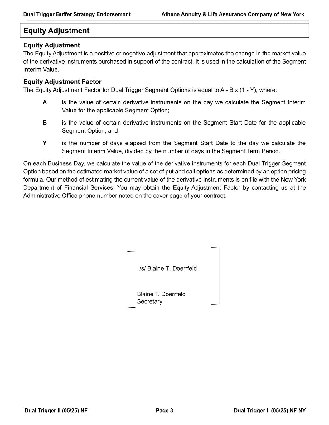 Trigger Buffer Strategy Endorsement Athene Annuity & Life Assurance Company of New York Trigger II (05/25) NF Page 3 Trigger II (05/25) NF NY Equity Adjustment Equity Adjustment The Equity Adjustment is a positive or negative adjustment that approximates the change in the market value of the derivative instruments purchased in support of the contract. It is used in the calculation of the Segment Interim Value. Equity Adjustment Factor The Equity Adjustment Factor for Trigger Segment Options is equal to A - B x (1 - Y), where: A is the value of certain derivative instruments on the day we calculate the Segment Interim Value for the applicable Segment Option; B is the value of certain derivative instruments on the Segment Start Date for the applicable Segment Option; and Y is the number of days elapsed from the Segment Start Date to the day we calculate the Segment Interim Value, divided by the number of days in the Segment Term Period. On each Business Day, we calculate the value of the derivative instruments for each Trigger Segment Option based on the estimated market value of a set of put and call options as determined by an option pricing formula. Our method of estimating the current value of the derivative instruments is on file with the New York Department of Financial Services. You may obtain the Equity Adjustment Factor by contacting us at the Administrative Office phone number noted on the cover page of your contract. Blaine T. Doerrfeld Secretary /s/ Blaine T. Doerrfeld