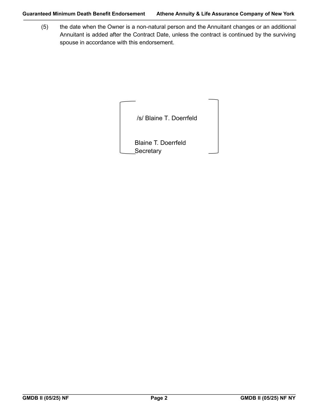 Guaranteed Minimum Death Benefit Endorsement Athene Annuity & Life Assurance Company of New York GMDB II (05/25) NF Page 2 GMDB II (05/25) NF NY (5) the date when the Owner is a non-natural person and the Annuitant changes or an additional Annuitant is added after the Contract Date, unless the contract is continued by the surviving spouse in accordance with this endorsement. Blaine T. Doerrfeld Secretary /s/ Blaine T. Doerrfeld