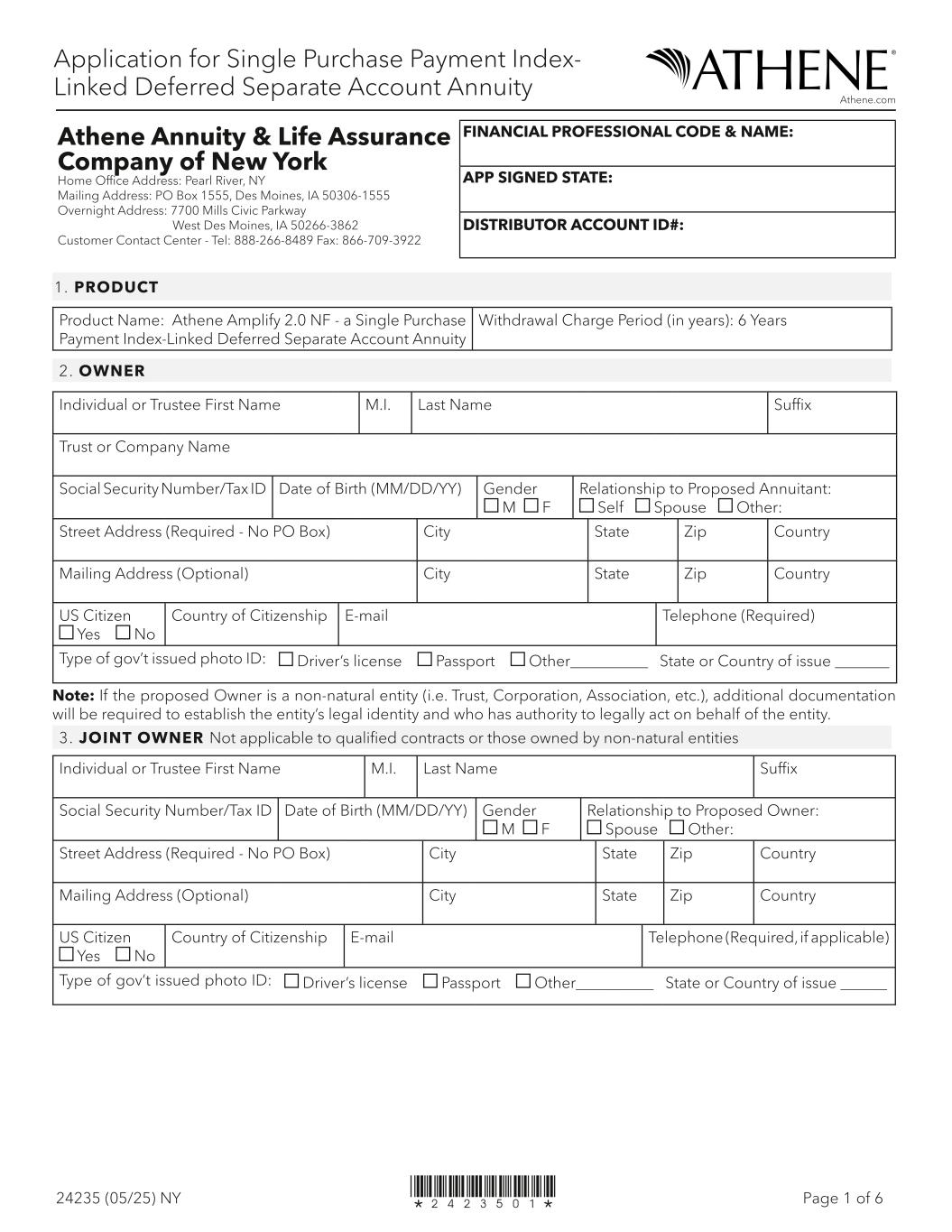Page 1 of 624235 (05/25) NY *2423501* 1. PRODUCT Product Name: Athene Amplify 2.0 NF - a Single Purchase Payment Index-Linked Deferred Separate Account Annuity Withdrawal Charge Period (in years): 6 Years 2. OWNER Individual or Trustee First Name M.I. Last Name Suffix Trust or Company Name Social Security Number/Tax ID Date of Birth (MM/DD/YY) Gender M F Relationship to Proposed Annuitant: Self Spouse Other: Street Address (Required - No PO Box) City State Zip Country Mailing Address (Optional) City State Zip Country US Citizen Yes No Country of Citizenship E-mail Telephone (Required) Type of gov’t issued photo ID: Driver’s license Passport Other__________ State or Country of issue _______ Note: If the proposed Owner is a non-natural entity (i.e. Trust, Corporation, Association, etc.), additional documentation will be required to establish the entity’s legal identity and who has authority to legally act on behalf of the entity. 3. JOINT OWNER Not applicable to qualified contracts or those owned by non-natural entities Individual or Trustee First Name M.I. Last Name Suffix Social Security Number/Tax ID Date of Birth (MM/DD/YY) Gender M F Relationship to Proposed Owner: Spouse Other: Street Address (Required - No PO Box) City State Zip Country Mailing Address (Optional) City State Zip Country US Citizen Yes No Country of Citizenship E-mail Telephone (Required, if applicable) Type of gov’t issued photo ID: Driver’s license Passport Other__________ State or Country of issue ______ Athene.com Athene Annuity & Life Assurance Company of New York Home Office Address: Pearl River, NY Mailing Address: PO Box 1555, Des Moines, IA 50306-1555 Overnight Address: 7700 Mills Civic Parkway West Des Moines, IA 50266-3862 Customer Contact Center - Tel: 888-266-8489 Fax: 866-709-3922 FINANCIAL PROFESSIONAL CODE & NAME: APP SIGNED STATE: DISTRIBUTOR ACCOUNT ID#: Application for Single Purchase Payment Index- Linked Deferred Separate Account Annuity