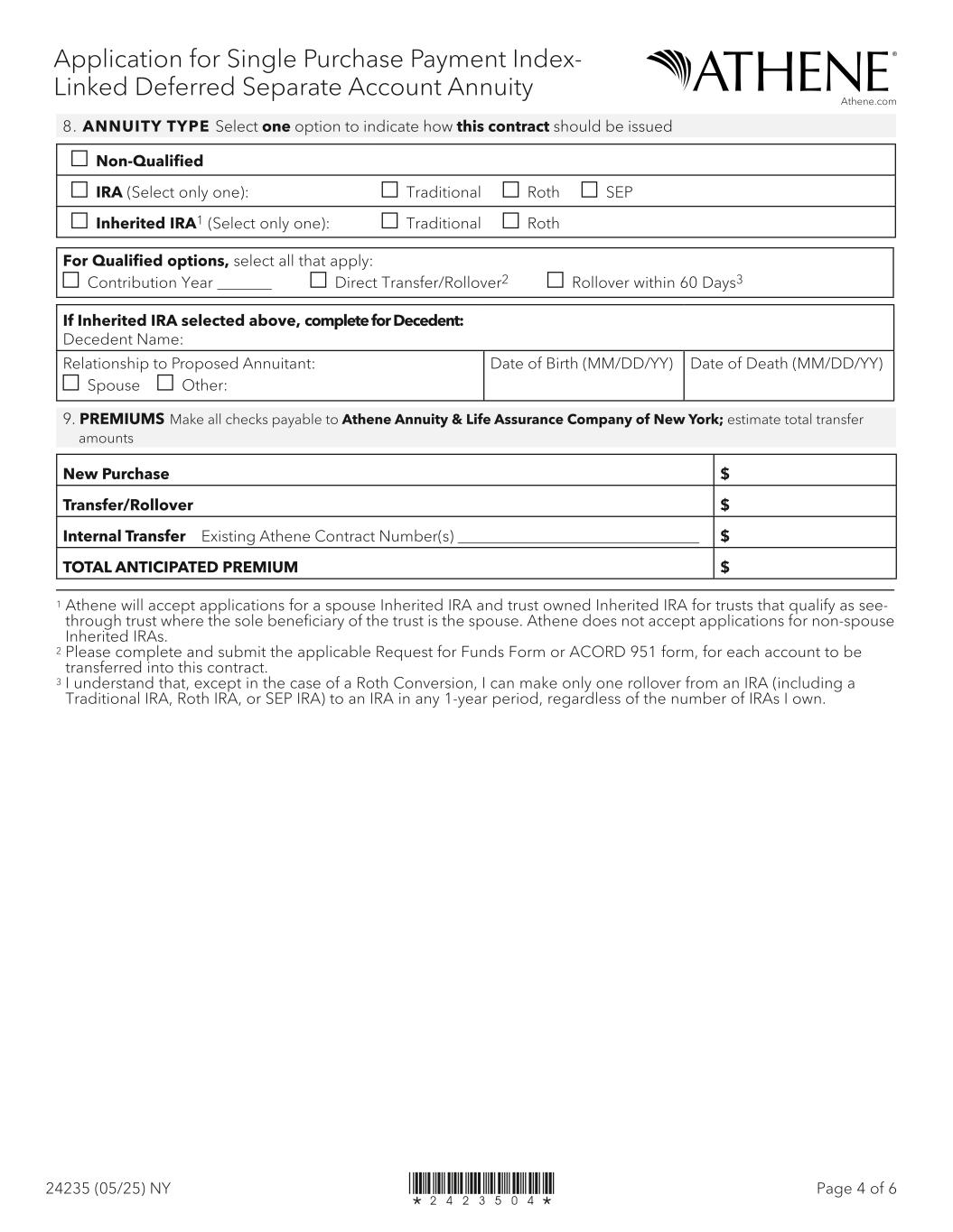 8. ANNUITY TYPE Select one option to indicate how this contract should be issued Non-Qualified IRA (Select only one): Traditional Roth SEP Inherited IRA1 (Select only one): Traditional Roth For Qualified options, select all that apply: Contribution Year _______ Direct Transfer/Rollover2 Rollover within 60 Days3 If Inherited IRA selected above, complete for Decedent: Decedent Name: Relationship to Proposed Annuitant: Spouse Other: Date of Birth (MM/DD/YY) Date of Death (MM/DD/YY) 9. PREMIUMS Make all checks payable to Athene Annuity & Life Assurance Company of New York; estimate total transfer amounts New Purchase $ Transfer/Rollover $ Internal Transfer Existing Athene Contract Number(s) _______________________________ $ TOTAL ANTICIPATED PREMIUM $ 1 Athene will accept applications for a spouse Inherited IRA and trust owned Inherited IRA for trusts that qualify as see- through trust where the sole beneficiary of the trust is the spouse. Athene does not accept applications for non-spouse Inherited IRAs. 2 Please complete and submit the applicable Request for Funds Form or ACORD 951 form, for each account to be transferred into this contract. 3 I understand that, except in the case of a Roth Conversion, I can make only one rollover from an IRA (including a Traditional IRA, Roth IRA, or SEP IRA) to an IRA in any 1-year period, regardless of the number of IRAs I own. 24235 (05/25) NY Page 4 of 6 Athene.com *2423504* Application for Single Purchase Payment Index- Linked Deferred Separate Account Annuity