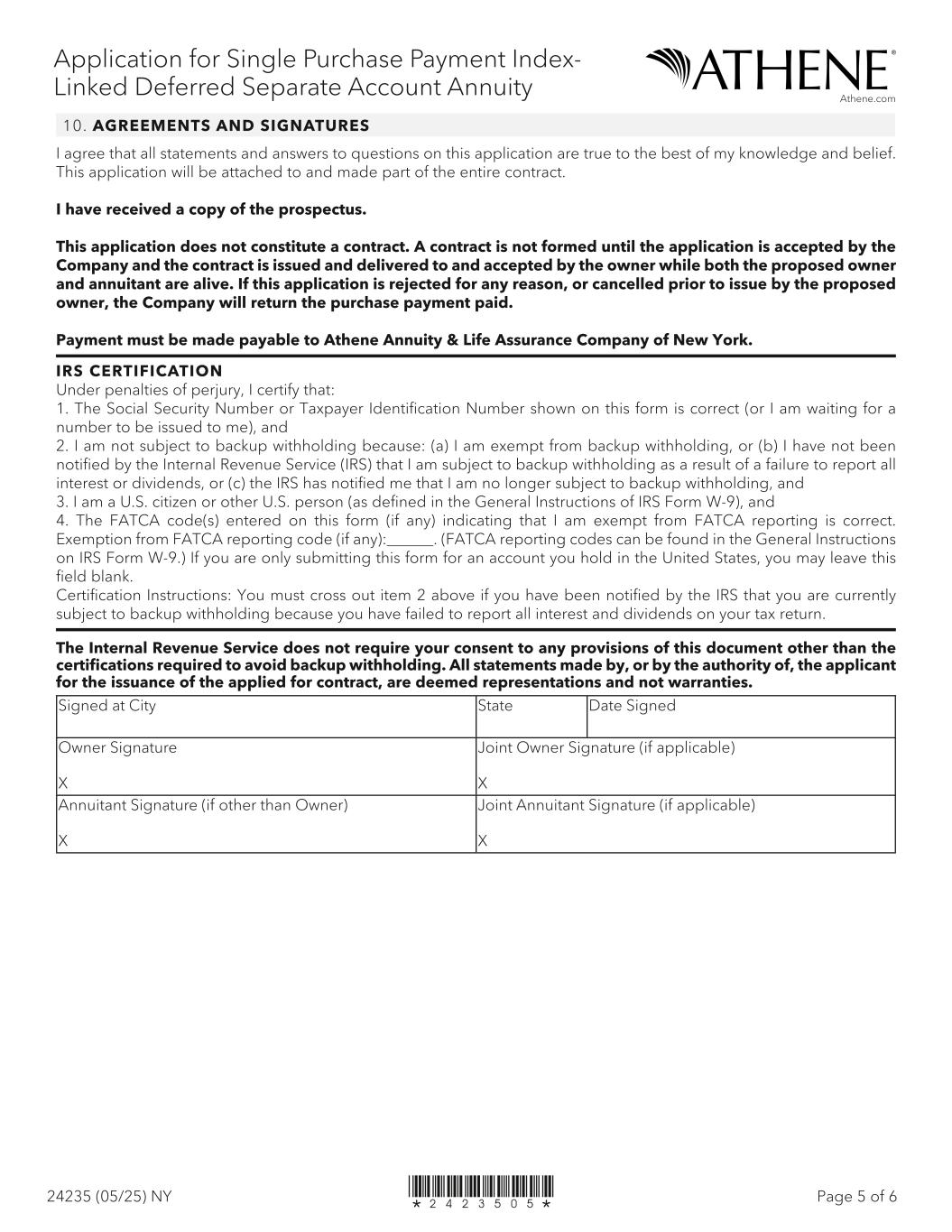 10. AGREEMENTS AND SIGNATURES I agree that all statements and answers to questions on this application are true to the best of my knowledge and belief. This application will be attached to and made part of the entire contract. I have received a copy of the prospectus. This application does not constitute a contract. A contract is not formed until the application is accepted by the Company and the contract is issued and delivered to and accepted by the owner while both the proposed owner and annuitant are alive. If this application is rejected for any reason, or cancelled prior to issue by the proposed owner, the Company will return the purchase payment paid. Payment must be made payable to Athene Annuity & Life Assurance Company of New York. IRS CERTIFICATION Under penalties of perjury, I certify that: 1. The Social Security Number or Taxpayer Identification Number shown on this form is correct (or I am waiting for a number to be issued to me), and 2. I am not subject to backup withholding because: (a) I am exempt from backup withholding, or (b) I have not been notified by the Internal Revenue Service (IRS) that I am subject to backup withholding as a result of a failure to report all interest or dividends, or (c) the IRS has notified me that I am no longer subject to backup withholding, and 3. I am a U.S. citizen or other U.S. person (as defined in the General Instructions of IRS Form W-9), and 4. The FATCA code(s) entered on this form (if any) indicating that I am exempt from FATCA reporting is correct. Exemption from FATCA reporting code (if any):______. (FATCA reporting codes can be found in the General Instructions on IRS Form W-9.) If you are only submitting this form for an account you hold in the United States, you may leave this field blank. Certification Instructions: You must cross out item 2 above if you have been notified by the IRS that you are currently subject to backup withholding because you have failed to report all interest and dividends on your tax return. The Internal Revenue Service does not require your consent to any provisions of this document other than the certifications required to avoid backup withholding. All statements made by, or by the authority of, the applicant for the issuance of the applied for contract, are deemed representations and not warranties. Signed at City State Date Signed Owner Signature X Joint Owner Signature (if applicable) X Annuitant Signature (if other than Owner) X Joint Annuitant Signature (if applicable) X Page 5 of 624235 (05/25) NY Athene.com *2423505* Application for Single Purchase Payment Index- Linked Deferred Separate Account Annuity