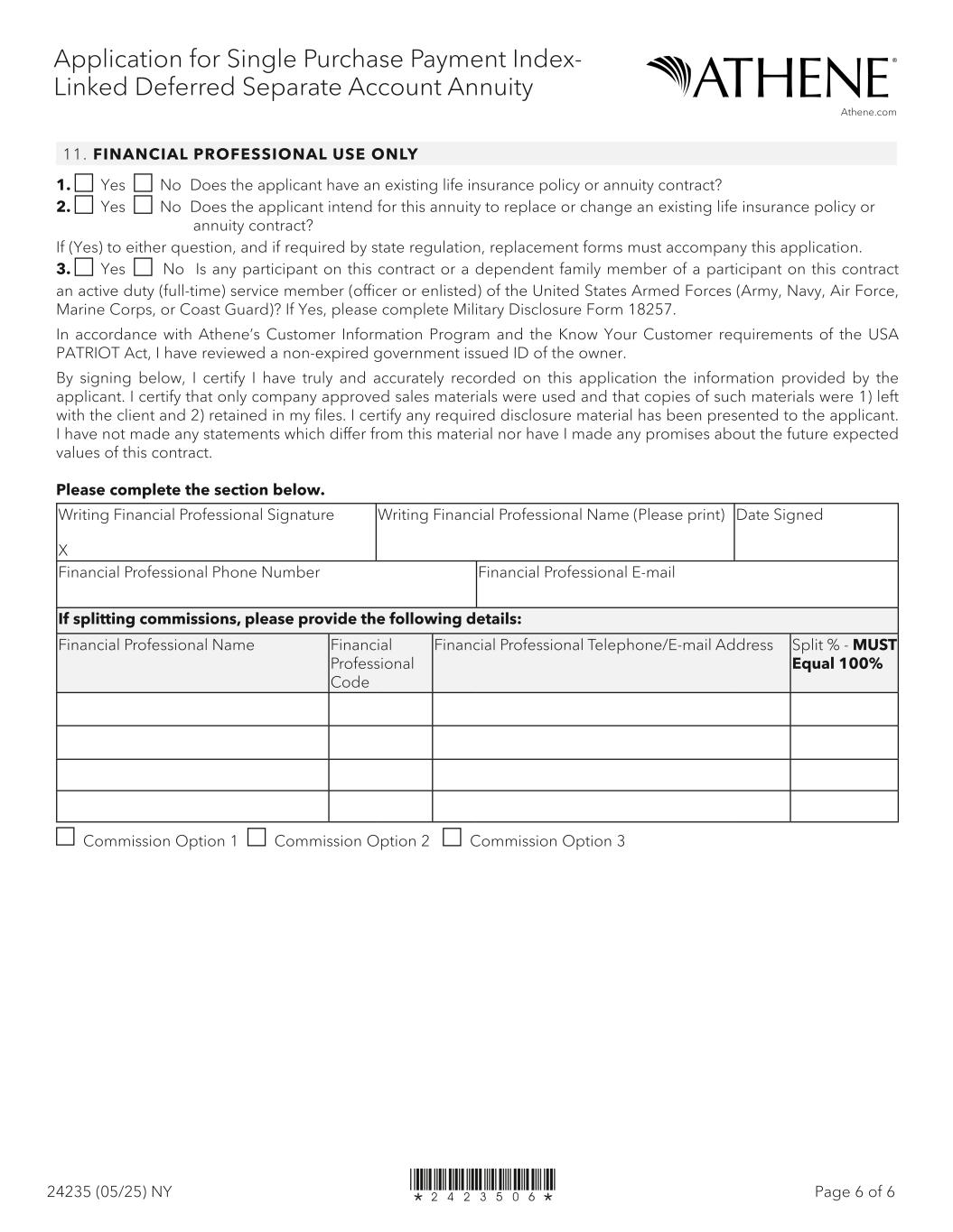 Athene.com 11. FINANCIAL PROFESSIONAL USE ONLY 1. Yes No Does the applicant have an existing life insurance policy or annuity contract? 2. Yes No Does the applicant intend for this annuity to replace or change an existing life insurance policy or annuity contract? If (Yes) to either question, and if required by state regulation, replacement forms must accompany this application. 3. Yes No Is any participant on this contract or a dependent family member of a participant on this contract an active duty (full-time) service member (officer or enlisted) of the United States Armed Forces (Army, Navy, Air Force, Marine Corps, or Coast Guard)? If Yes, please complete Military Disclosure Form 18257. In accordance with Athene’s Customer Information Program and the Know Your Customer requirements of the USA PATRIOT Act, I have reviewed a non-expired government issued ID of the owner. By signing below, I certify I have truly and accurately recorded on this application the information provided by the applicant. I certify that only company approved sales materials were used and that copies of such materials were 1) left with the client and 2) retained in my files. I certify any required disclosure material has been presented to the applicant. I have not made any statements which differ from this material nor have I made any promises about the future expected values of this contract. Please complete the section below. Writing Financial Professional Signature X Writing Financial Professional Name (Please print) Date Signed Financial Professional Phone Number Financial Professional E-mail If splitting commissions, please provide the following details: Financial Professional Name Financial Professional Code Financial Professional Telephone/E-mail Address Split % - MUST Equal 100% Commission Option 1 Commission Option 2 Commission Option 3 Page 6 of 624235 (05/25) NY *2423506* Application for Single Purchase Payment Index- Linked Deferred Separate Account Annuity