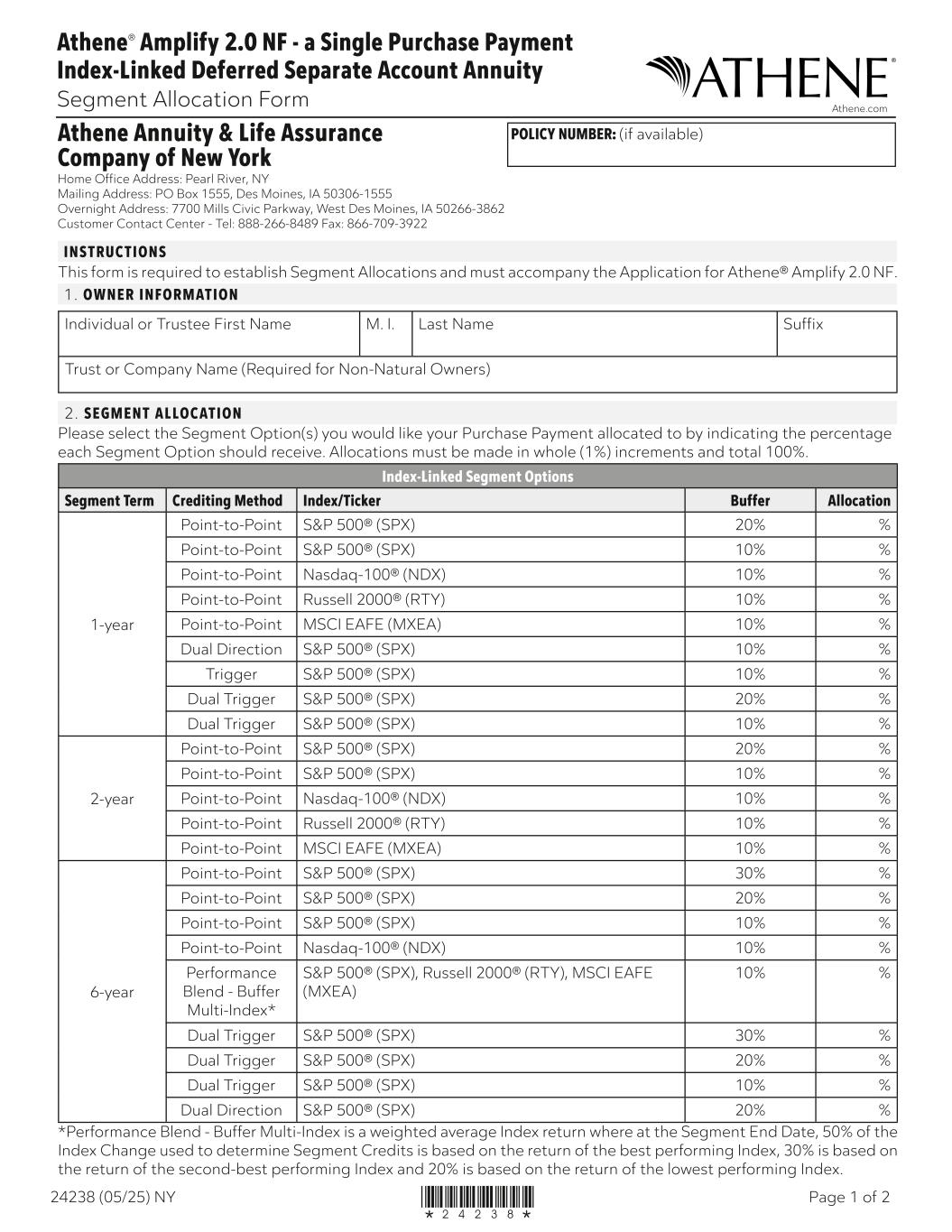 Athene.com Athene Annuity & Life Assurance Company of New York Home Office Address: Pearl River, NY Mailing Address: PO Box 1555, Des Moines, IA 50306-1555 Overnight Address: 7700 Mills Civic Parkway, West Des Moines, IA 50266-3862 Customer Contact Center - Tel: 888-266-8489 Fax: 866-709-3922 POLICY NUMBER: (if available) Athene® Amplify 2.0 NF - a Single Purchase Payment Index-Linked Deferred Separate Account Annuity Segment Allocation Form Page 1 of 224238 (05/25) NY *24238* INSTRUCTIONS This form is required to establish Segment Allocations and must accompany the Application for Athene® Amplify 2.0 NF. 1. OWNER INFORMATION Individual or Trustee First Name M. I. Last Name Suffix Trust or Company Name (Required for Non-Natural Owners) 2. SEGMENT ALLOCATION Please select the Segment Option(s) you would like your Purchase Payment allocated to by indicating the percentage each Segment Option should receive. Allocations must be made in whole (1%) increments and total 100%. Index-Linked Segment Options Segment Term Crediting Method Index/Ticker Buffer Allocation 1-year Point-to-Point S&P 500® (SPX) 20% % Point-to-Point S&P 500® (SPX) 10% % Point-to-Point Nasdaq-100® (NDX) 10% % Point-to-Point Russell 2000® (RTY) 10% % Point-to-Point MSCI EAFE (MXEA) 10% % Dual Direction S&P 500® (SPX) 10% % Trigger S&P 500® (SPX) 10% % Dual Trigger S&P 500® (SPX) 20% % Dual Trigger S&P 500® (SPX) 10% % 2-year Point-to-Point S&P 500® (SPX) 20% % Point-to-Point S&P 500® (SPX) 10% % Point-to-Point Nasdaq-100® (NDX) 10% % Point-to-Point Russell 2000® (RTY) 10% % Point-to-Point MSCI EAFE (MXEA) 10% % 6-year Point-to-Point S&P 500® (SPX) 30% % Point-to-Point S&P 500® (SPX) 20% % Point-to-Point S&P 500® (SPX) 10% % Point-to-Point Nasdaq-100® (NDX) 10% % Performance Blend - Buffer Multi-Index* S&P 500® (SPX), Russell 2000® (RTY), MSCI EAFE (MXEA) 10% % Dual Trigger S&P 500® (SPX) 30% % Dual Trigger S&P 500® (SPX) 20% % Dual Trigger S&P 500® (SPX) 10% % Dual Direction S&P 500® (SPX) 20% % *Performance Blend - Buffer Multi-Index is a weighted average Index return where at the Segment End Date, 50% of the Index Change used to determine Segment Credits is based on the return of the best performing Index, 30% is based on the return of the second-best performing Index and 20% is based on the return of the lowest performing Index.