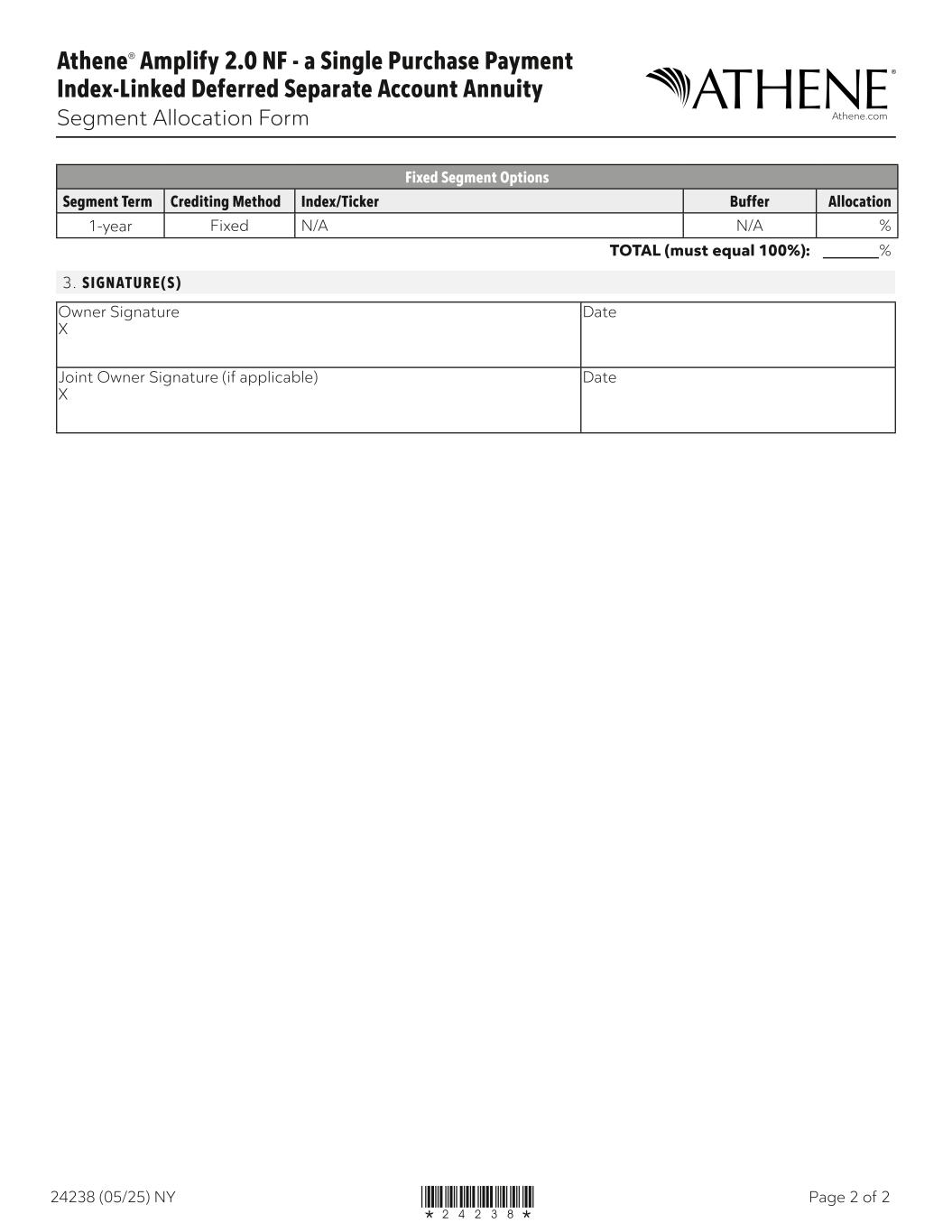 Athene.com Fixed Segment Options Segment Term Crediting Method Index/Ticker Buffer Allocation 1-year Fixed N/A N/A % TOTAL (must equal 100%): % 3. SIGNATURE(S) Owner Signature X Date Joint Owner Signature (if applicable) X Date Page 2 of 224238 (05/25) NY *24238* Athene® Amplify 2.0 NF - a Single Purchase Payment Index-Linked Deferred Separate Account Annuity Segment Allocation Form
