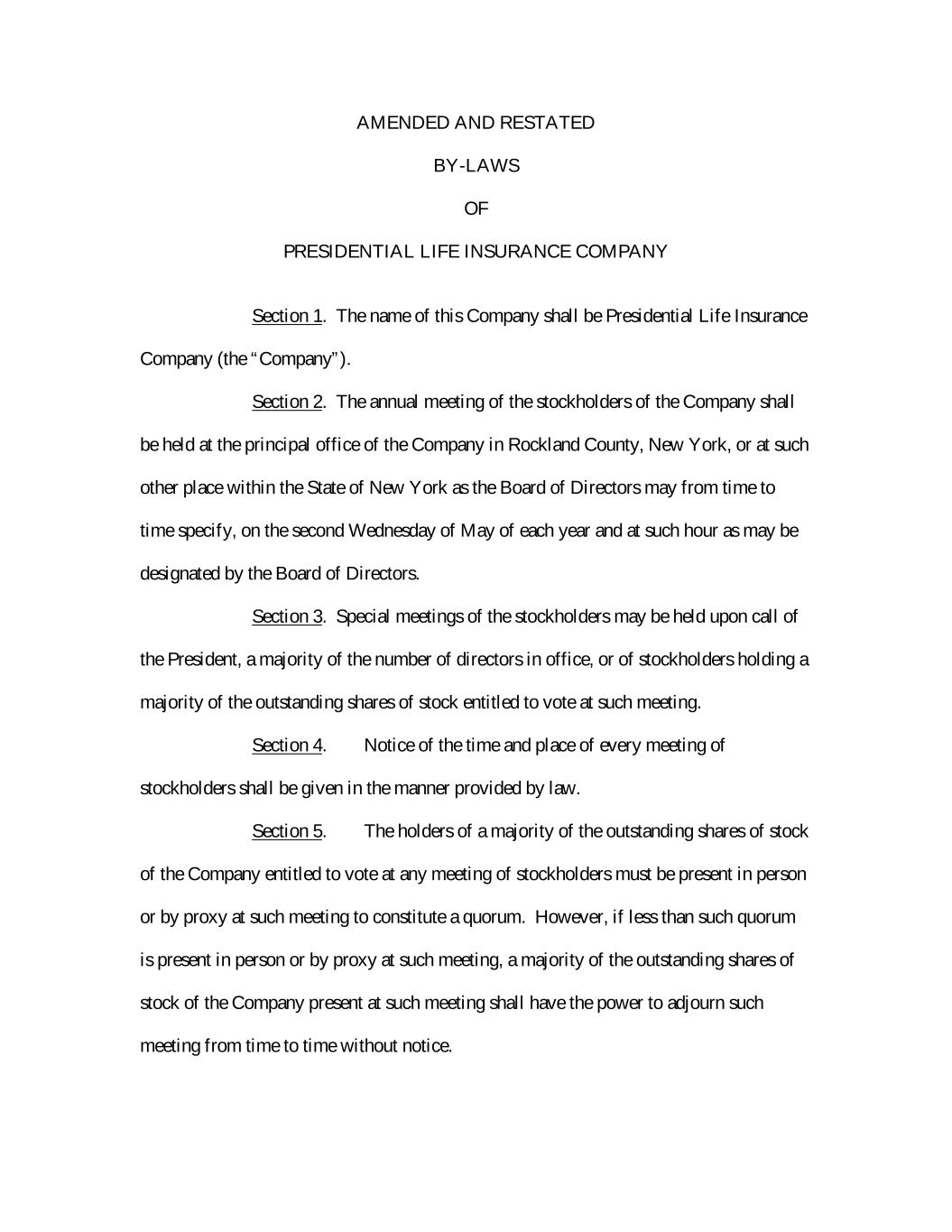 AMENDED AND RESTATED BY-LAWS OF PRESIDENTIAL LIFE INSURANCE COMPANY Section 1. The name of this Company shall be Presidential Life Insurance Company (the “Company”). Section 2. The annual meeting of the stockholders of the Company shall be held at the principal office of the Company in Rockland County, New York, or at such other place within the State of New York as the Board of Directors may from time to time specify, on the second Wednesday of May of each year and at such hour as may be designated by the Board of Directors. Section 3. Special meetings of the stockholders may be held upon call of the President, a majority of the number of directors in office, or of stockholders holding a majority of the outstanding shares of stock entitled to vote at such meeting. Section 4. Notice of the time and place of every meeting of stockholders shall be given in the manner provided by law. Section 5. The holders of a majority of the outstanding shares of stock of the Company entitled to vote at any meeting of stockholders must be present in person or by proxy at such meeting to constitute a quorum. However, if less than such quorum is present in person or by proxy at such meeting, a majority of the outstanding shares of stock of the Company present at such meeting shall have the power to adjourn such meeting from time to time without notice.