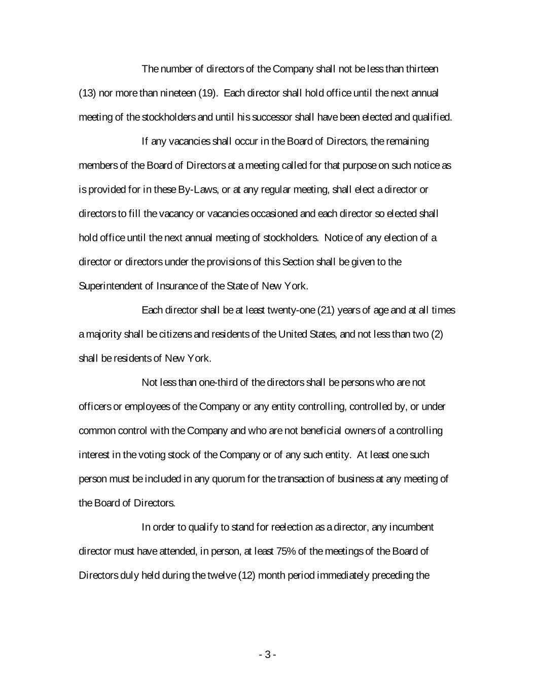 - 3 - The number of directors of the Company shall not be less than thirteen (13) nor more than nineteen (19). Each director shall hold office until the next annual meeting of the stockholders and until his successor shall have been elected and qualified. If any vacancies shall occur in the Board of Directors, the remaining members of the Board of Directors at a meeting called for that purpose on such notice as is provided for in these By-Laws, or at any regular meeting, shall elect a director or directors to fill the vacancy or vacancies occasioned and each director so elected shall hold office until the next annual meeting of stockholders. Notice of any election of a director or directors under the provisions of this Section shall be given to the Superintendent of Insurance of the State of New York. Each director shall be at least twenty-one (21) years of age and at all times a majority shall be citizens and residents of the United States, and not less than two (2) shall be residents of New York. Not less than one-third of the directors shall be persons who are not officers or employees of the Company or any entity controlling, controlled by, or under common control with the Company and who are not beneficial owners of a controlling interest in the voting stock of the Company or of any such entity. At least one such person must be included in any quorum for the transaction of business at any meeting of the Board of Directors. In order to qualify to stand for reelection as a director, any incumbent director must have attended, in person, at least 75% of the meetings of the Board of Directors duly held during the twelve (12) month period immediately preceding the