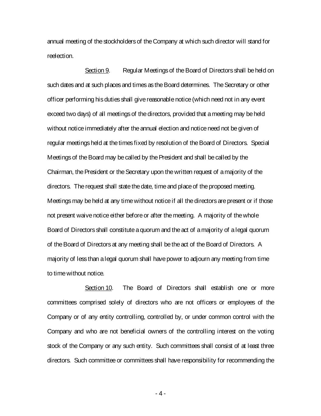 - 4 - annual meeting of the stockholders of the Company at which such director will stand for reelection. Section 9. Regular Meetings of the Board of Directors shall be held on such dates and at such places and times as the Board determines. The Secretary or other officer performing his duties shall give reasonable notice (which need not in any event exceed two days) of all meetings of the directors, provided that a meeting may be held without notice immediately after the annual election and notice need not be given of regular meetings held at the times fixed by resolution of the Board of Directors. Special Meetings of the Board may be called by the President and shall be called by the Chairman, the President or the Secretary upon the written request of a majority of the directors. The request shall state the date, time and place of the proposed meeting. Meetings may be held at any time without notice if all the directors are present or if those not present waive notice either before or after the meeting. A majority of the whole Board of Directors shall constitute a quorum and the act of a majority of a legal quorum of the Board of Directors at any meeting shall be the act of the Board of Directors. A majority of less than a legal quorum shall have power to adjourn any meeting from time to time without notice. Section 10. The Board of Directors shall establish one or more committees comprised solely of directors who are not officers or employees of the Company or of any entity controlling, controlled by, or under common control with the Company and who are not beneficial owners of the controlling interest on the voting stock of the Company or any such entity. Such committees shall consist of at least three directors. Such committee or committees shall have responsibility for recommending the