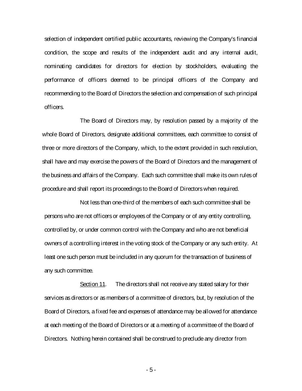 - 5 - selection of independent certified public accountants, reviewing the Company's financial condition, the scope and results of the independent audit and any internal audit, nominating candidates for directors for election by stockholders, evaluating the performance of officers deemed to be principal officers of the Company and recommending to the Board of Directors the selection and compensation of such principal officers. The Board of Directors may, by resolution passed by a majority of the whole Board of Directors, designate additional committees, each committee to consist of three or more directors of the Company, which, to the extent provided in such resolution, shall have and may exercise the powers of the Board of Directors and the management of the business and affairs of the Company. Each such committee shall make its own rules of procedure and shall report its proceedings to the Board of Directors when required. Not less than one-third of the members of each such committee shall be persons who are not officers or employees of the Company or of any entity controlling, controlled by, or under common control with the Company and who are not beneficial owners of a controlling interest in the voting stock of the Company or any such entity. At least one such person must be included in any quorum for the transaction of business of any such committee. Section 11. The directors shall not receive any stated salary for their services as directors or as members of a committee of directors, but, by resolution of the Board of Directors, a fixed fee and expenses of attendance may be allowed for attendance at each meeting of the Board of Directors or at a meeting of a committee of the Board of Directors. Nothing herein contained shall be construed to preclude any director from
