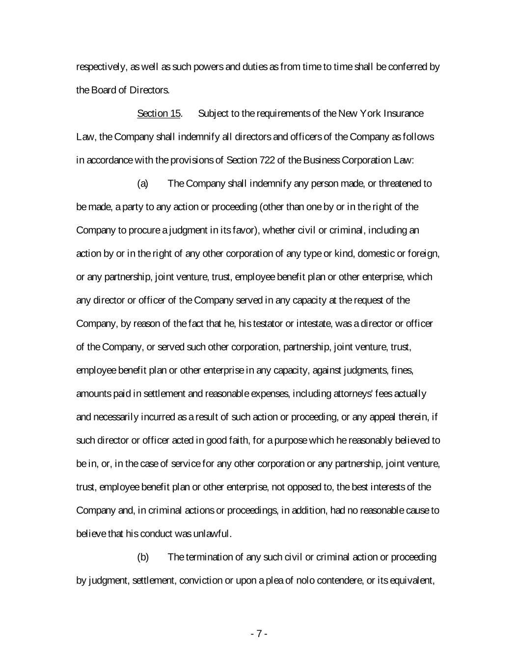 - 7 - respectively, as well as such powers and duties as from time to time shall be conferred by the Board of Directors. Section 15. Subject to the requirements of the New York Insurance Law, the Company shall indemnify all directors and officers of the Company as follows in accordance with the provisions of Section 722 of the Business Corporation Law: (a) The Company shall indemnify any person made, or threatened to be made, a party to any action or proceeding (other than one by or in the right of the Company to procure a judgment in its favor), whether civil or criminal, including an action by or in the right of any other corporation of any type or kind, domestic or foreign, or any partnership, joint venture, trust, employee benefit plan or other enterprise, which any director or officer of the Company served in any capacity at the request of the Company, by reason of the fact that he, his testator or intestate, was a director or officer of the Company, or served such other corporation, partnership, joint venture, trust, employee benefit plan or other enterprise in any capacity, against judgments, fines, amounts paid in settlement and reasonable expenses, including attorneys' fees actually and necessarily incurred as a result of such action or proceeding, or any appeal therein, if such director or officer acted in good faith, for a purpose which he reasonably believed to be in, or, in the case of service for any other corporation or any partnership, joint venture, trust, employee benefit plan or other enterprise, not opposed to, the best interests of the Company and, in criminal actions or proceedings, in addition, had no reasonable cause to believe that his conduct was unlawful. (b) The termination of any such civil or criminal action or proceeding by judgment, settlement, conviction or upon a plea of nolo contendere, or its equivalent,