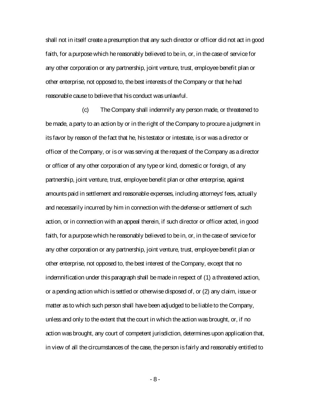 - 8 - shall not in itself create a presumption that any such director or officer did not act in good faith, for a purpose which he reasonably believed to be in, or, in the case of service for any other corporation or any partnership, joint venture, trust, employee benefit plan or other enterprise, not opposed to, the best interests of the Company or that he had reasonable cause to believe that his conduct was unlawful. (c) The Company shall indemnify any person made, or threatened to be made, a party to an action by or in the right of the Company to procure a judgment in its favor by reason of the fact that he, his testator or intestate, is or was a director or officer of the Company, or is or was serving at the request of the Company as a director or officer of any other corporation of any type or kind, domestic or foreign, of any partnership, joint venture, trust, employee benefit plan or other enterprise, against amounts paid in settlement and reasonable expenses, including attorneys' fees, actually and necessarily incurred by him in connection with the defense or settlement of such action, or in connection with an appeal therein, if such director or officer acted, in good faith, for a purpose which he reasonably believed to be in, or, in the case of service for any other corporation or any partnership, joint venture, trust, employee benefit plan or other enterprise, not opposed to, the best interest of the Company, except that no indemnification under this paragraph shall be made in respect of (1) a threatened action, or a pending action which is settled or otherwise disposed of, or (2) any claim, issue or matter as to which such person shall have been adjudged to be liable to the Company, unless and only to the extent that the court in which the action was brought, or, if no action was brought, any court of competent jurisdiction, determines upon application that, in view of all the circumstances of the case, the person is fairly and reasonably entitled to