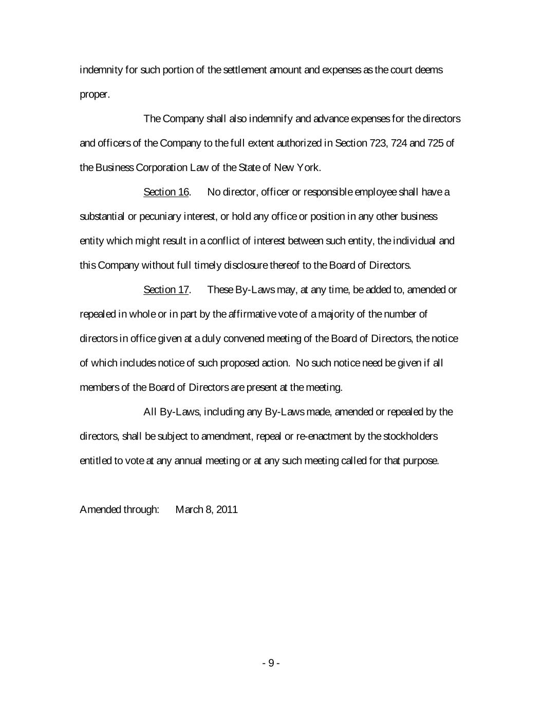 - 9 - indemnity for such portion of the settlement amount and expenses as the court deems proper. The Company shall also indemnify and advance expenses for the directors and officers of the Company to the full extent authorized in Section 723, 724 and 725 of the Business Corporation Law of the State of New York. Section 16. No director, officer or responsible employee shall have a substantial or pecuniary interest, or hold any office or position in any other business entity which might result in a conflict of interest between such entity, the individual and this Company without full timely disclosure thereof to the Board of Directors. Section 17. These By-Laws may, at any time, be added to, amended or repealed in whole or in part by the affirmative vote of a majority of the number of directors in office given at a duly convened meeting of the Board of Directors, the notice of which includes notice of such proposed action. No such notice need be given if all members of the Board of Directors are present at the meeting. All By-Laws, including any By-Laws made, amended or repealed by the directors, shall be subject to amendment, repeal or re-enactment by the stockholders entitled to vote at any annual meeting or at any such meeting called for that purpose. Amended through: March 8, 2011