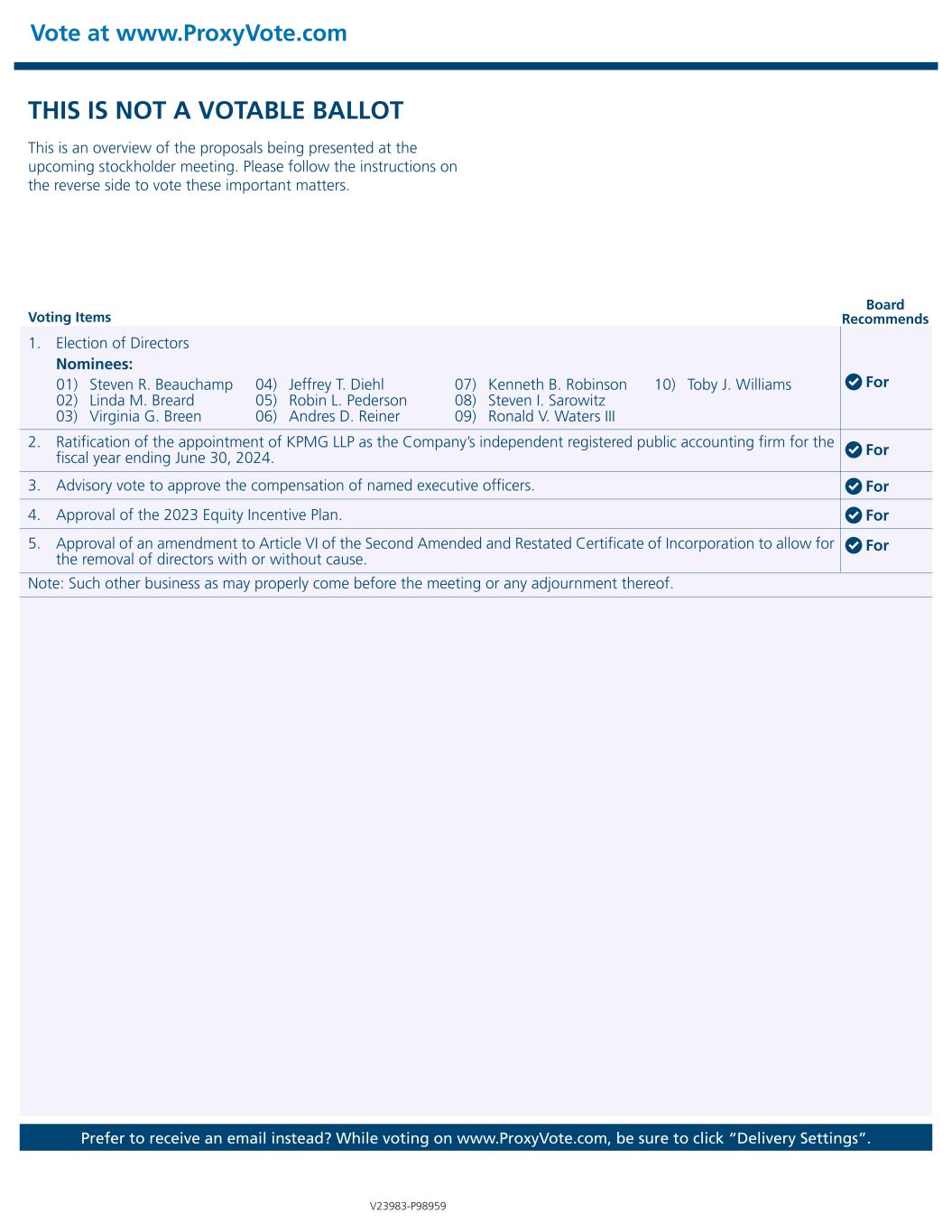 THIS IS NOT A VOTABLE BALLOT This is an overview of the proposals being presented at the upcoming stockholder meeting. Please follow the instructions on the reverse side to vote these important matters. Vote at www.ProxyVote.com Prefer to receive an email instead? While voting on www.ProxyVote.com, be sure to click “Delivery Settings”. Voting Items Board Recommends V23983-P98959 1. Election of Directors Nominees: 2. Ratification of the appointment of KPMG LLP as the Company’s independent registered public accounting firm for the fiscal year ending June 30, 2024. 3. Advisory vote to approve the compensation of named executive officers. 4. Approval of the 2023 Equity Incentive Plan. 5. Approval of an amendment to Article VI of the Second Amended and Restated Certificate of Incorporation to allow for the removal of directors with or without cause. Note: Such other business as may properly come before the meeting or any adjournment thereof. For For For For For 01) Steven R. Beauchamp 02) Linda M. Breard 03) Virginia G. Breen 04) Jeffrey T. Diehl 05) Robin L. Pederson 06) Andres D. Reiner 07) Kenneth B. Robinson 08) Steven I. Sarowitz 09) Ronald V. Waters III 10) Toby J. Williams