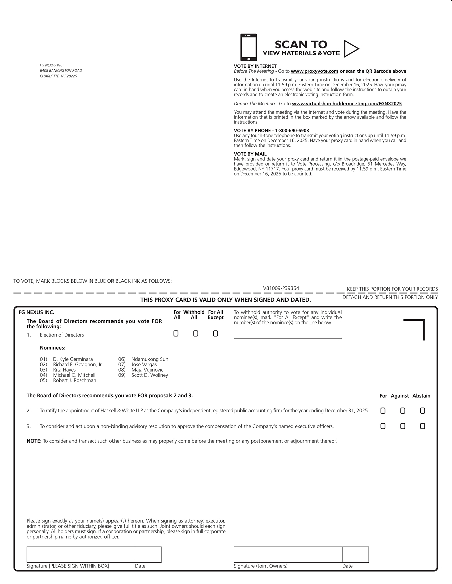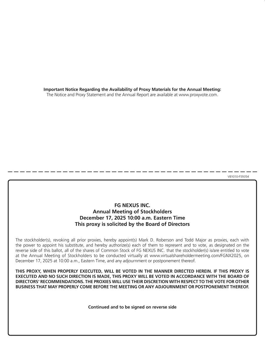 This Proxy Statement is furnished in connection with the solicitation of the accompanying proxies on behalf of the Board of Directors of FG Nexus Inc. (formerly known as Fundamental Global Inc. and FG Financial Group, Inc.) (the “Company”, “we”, “our” or “us”) for use at the Company’s 2025 Annual Meeting of Stockholders (the “Annual Meeting”), which will be conducted virtually at www.virtualshareholdermeeting.com/FGNX2025 on December 17, 2025 at 10:00 a.m. Eastern Time, and any adjournments or postponements of the Annual Meeting.